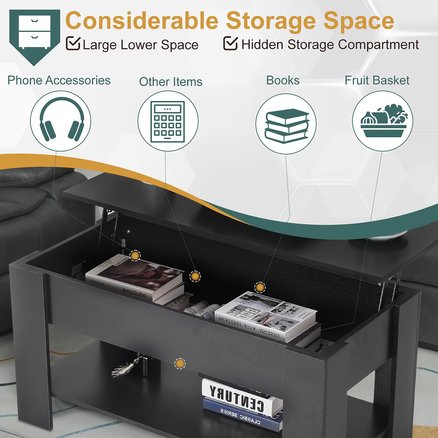 - 1.**Hidden Compartment and Storage Shelf:** Discover a concealed storage compartment within the lift coffee tabletop, ideal for storing remotes, magazines, and more. The additional lower storage shelf of our coffee tables provides extra space for keeping your living area organized. This dual-storage feature maximizes functionality while maintaining the lift top coffee table's sleek and clutter-free appearance.