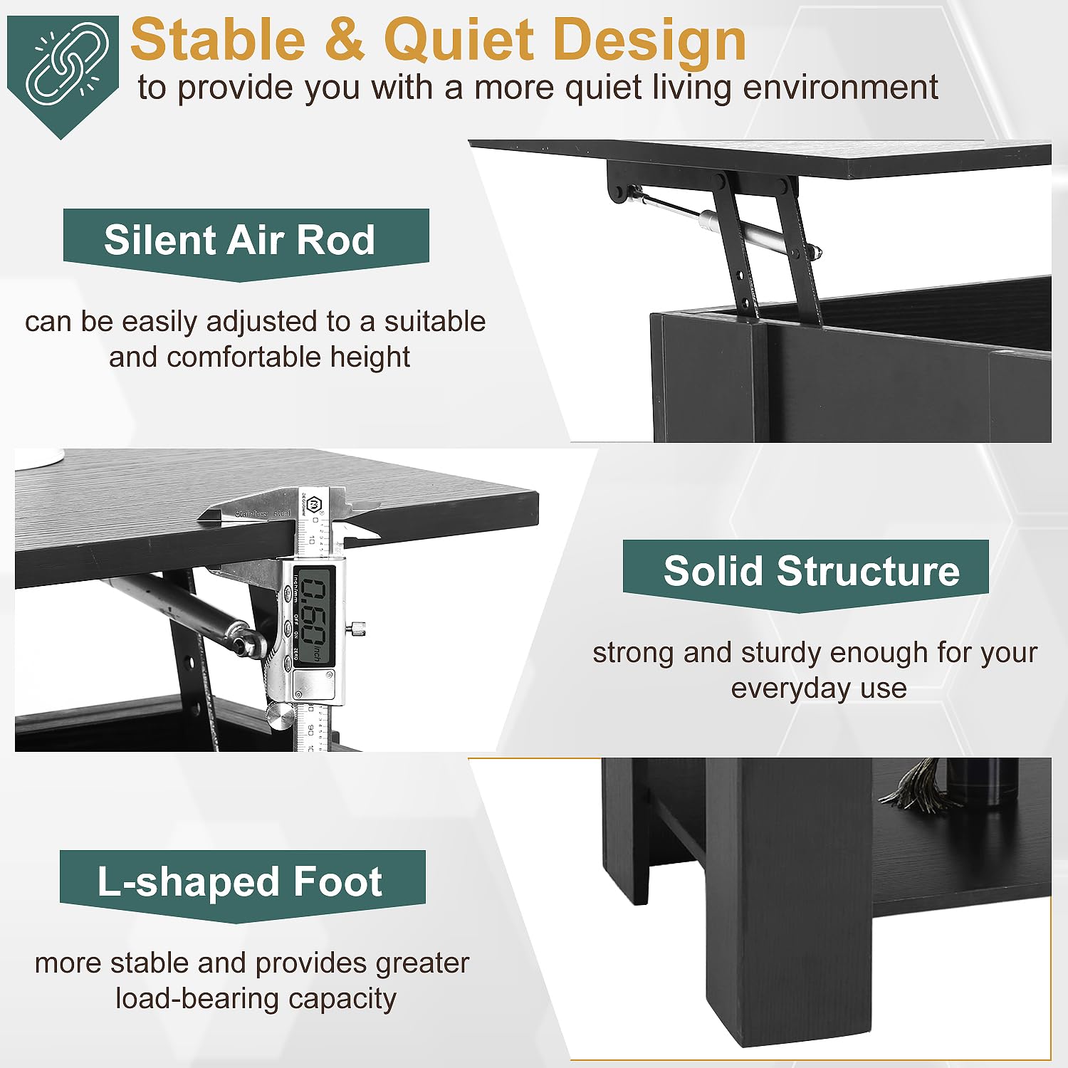 - 4.**Soft-Close/Open Mechanism:** The soft-close/open mechanism of our coffee table provides a gentle and quiet operation when accessing the hidden compartment. Enjoy the convenience of this lift top coffee table’s feature without abrupt movements or noise disruptions. Elevate your living space with a coffee table that embodies both form and function.