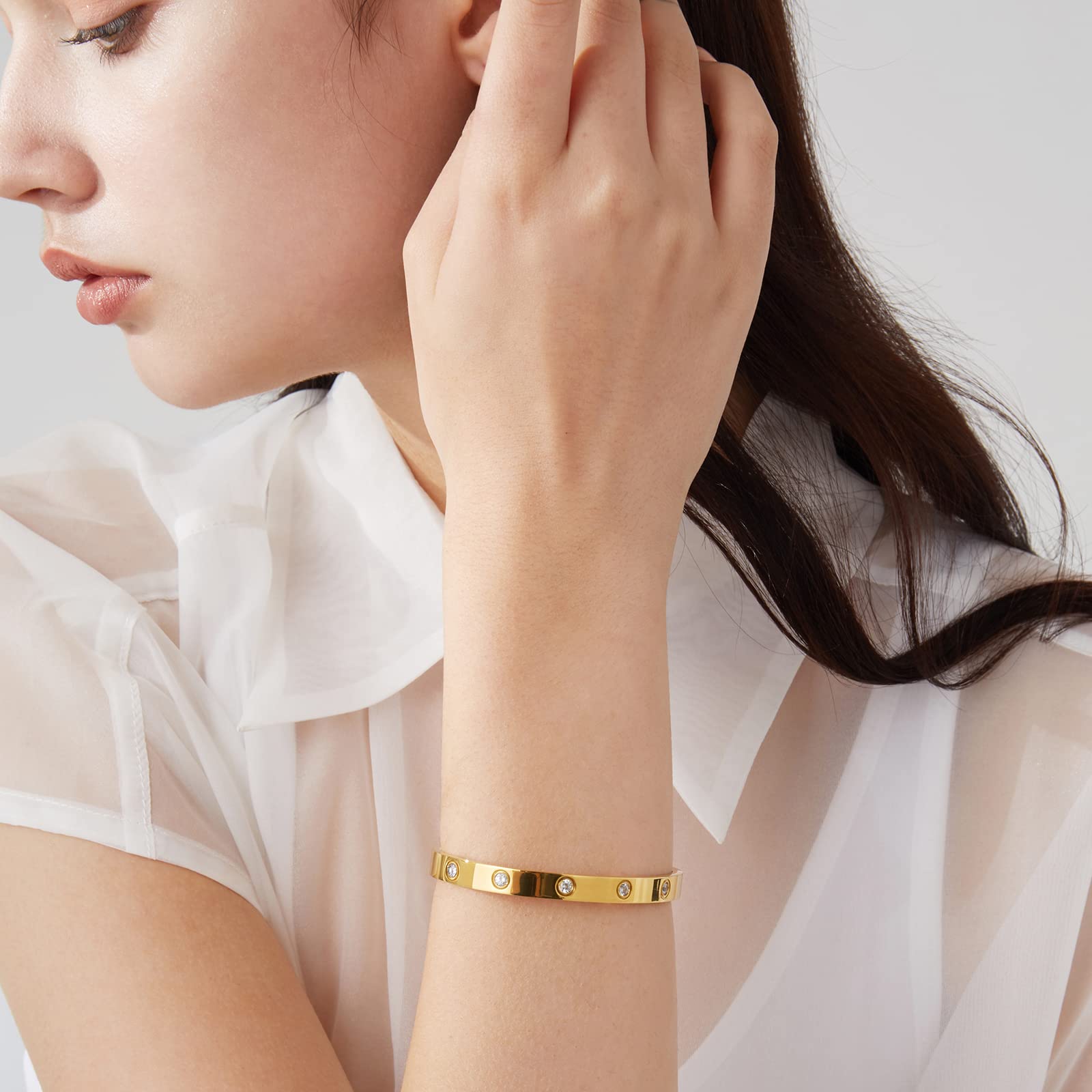 PDWZNBA 18K Gold Plated Love Friendship Bracelets with CZ Stones Trendy Stainless Steel Bangle Jewelry