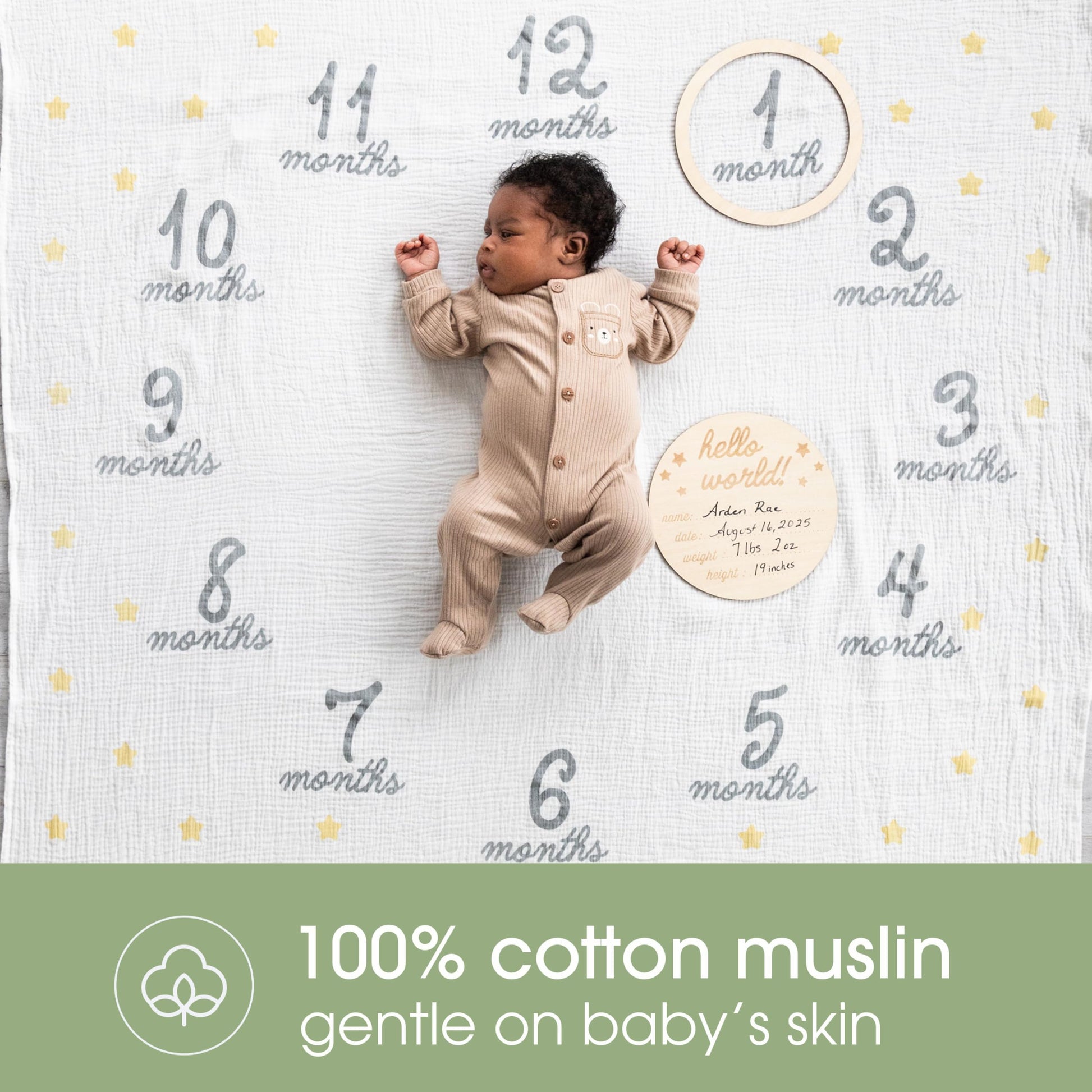 Details: Capture the magic of your newborn’s first year with Pearhead’s Baby Milestone Blanket and Photo Prop, where each moment becomes a shining star in your little one's journey. Made with love and care, our white cotton muslin blanket is adorned with delicate gold stars, radiating the magic of each milestone your baby achieves. Within a charming circle, the gray words '1 month' through '12 months' to elegantly mark your baby’s growth each month, offering a photoshoot backdrop for your baby’s first year photos. Lay your baby girl or baby boy on the super soft photo prop blanket and use the included wooden ring to frame each monthly milestone, adding a modern, neutral-colored aesthetic. This bundle also comes with our “Hello World” fill-in prop, a new baby must-have accessory to announce your baby’s arrival. Personalize this hospital birth announcement sign with your baby’s name, date of birth, weight, and height. This 2-in-1 milestone keepsake kit has everything you need to create special memories that will last a lifetime. This gender-neutral baby gift makes a great baby registry idea, baby shower gift, baby girl gift, baby boy gift, and expecting mom gift. Blanket Dimensions: 46.8” x 46.8”
