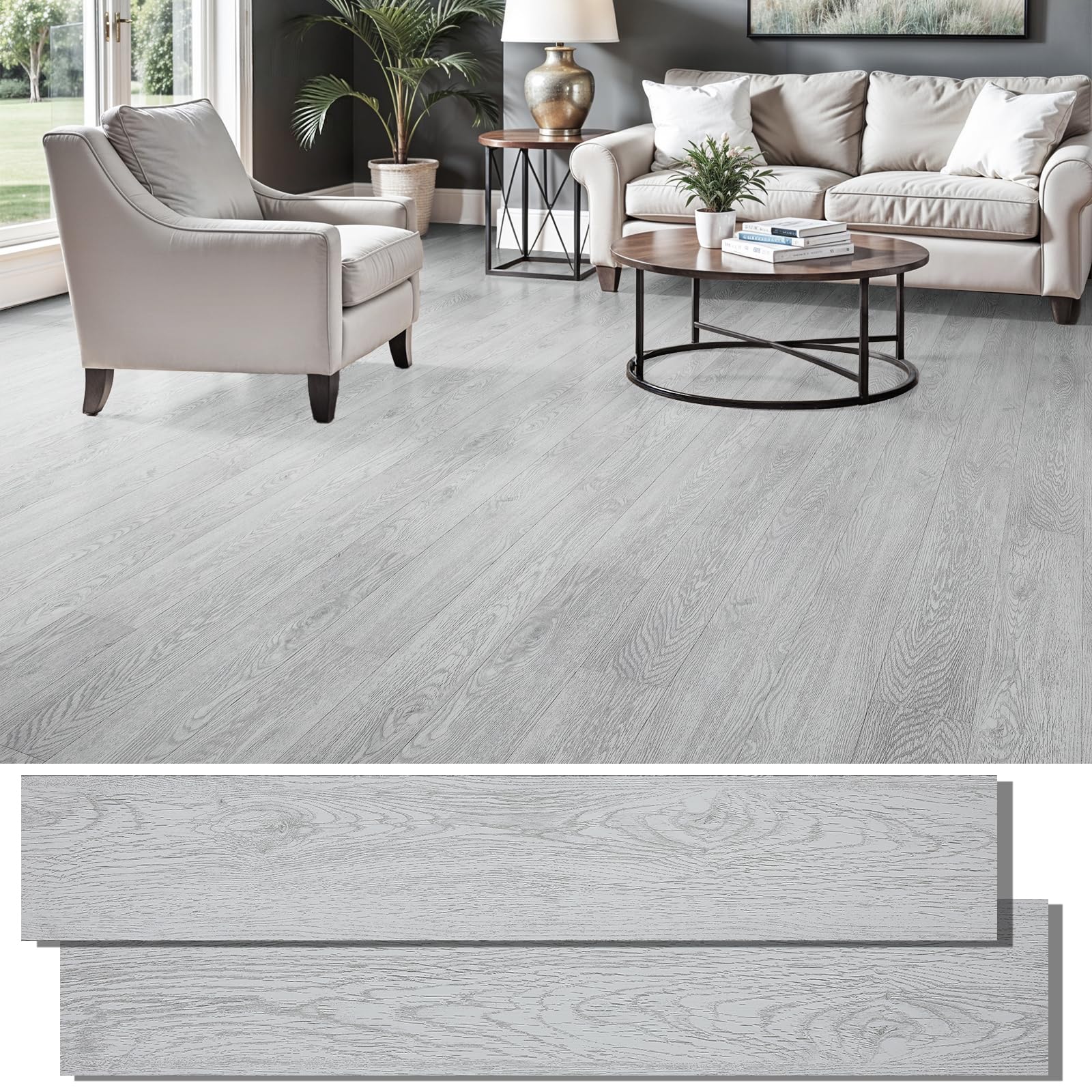 Peel and Stick Floor Tile, INMOZATA Self Adhesive Vinyl Plank Flooring Tile Wood Grain Look 36-Pack 54 Sq.Ft Waterproof Tile Sticker for Bedroom, Living Room, Kitchen, RV(Light Gray)