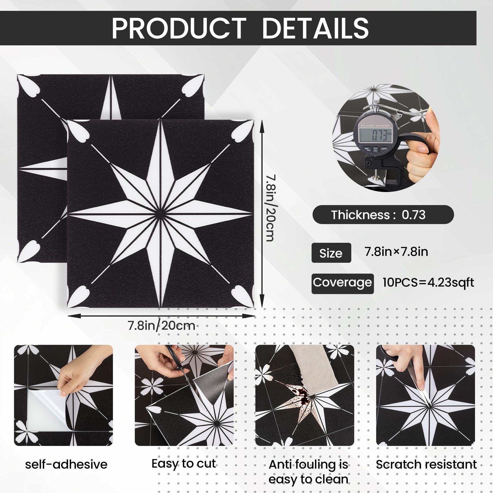 - PACKAGE SPECIFICATIONS: Each package of peel and stick floor tile includes 10 pieces of 8 inx 8 in stickers, which can cover an area of about 4.3 square feet. Vinyl floor tiles are 0.03 inches thick.This size is easy to apply and reduces wrinkles and bubbles during installation