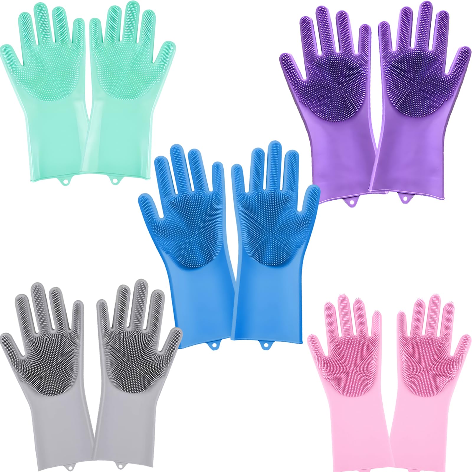 PEOKPIPLE 5 pairs Silicone Dishwashing & Pet Grooming Gloves - 2-in-1 Heat Resistant Gloves with High-Density Teeth, Enhanced Five Finger Design for Bathing, Cleaning Dishes, Cars, Dogs & Cats