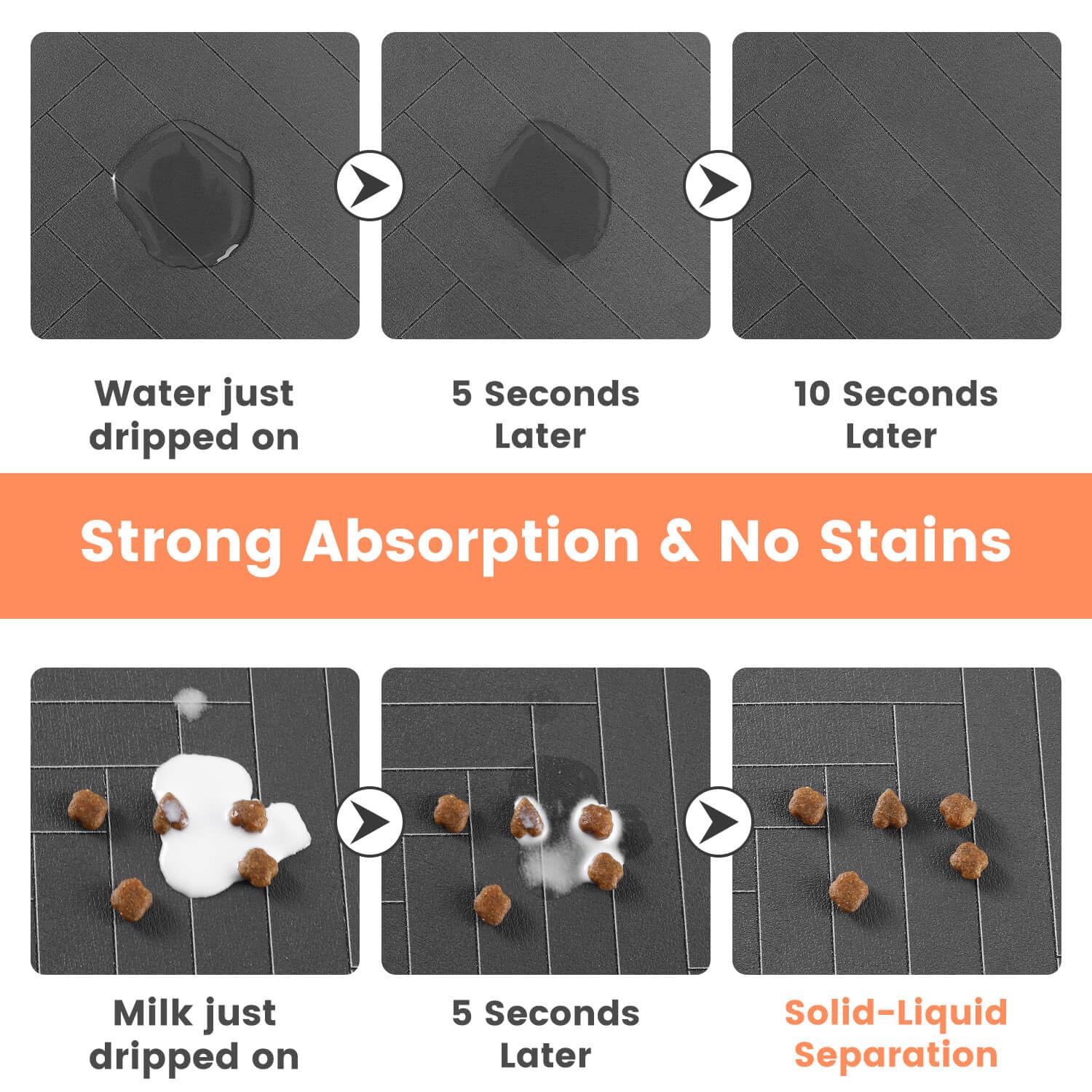 - 【Strong Absorbent & Stain-Resistant】Our dog food mat boasts exceptional absorbency, quickly soaking up any spilled water & milk and leaving no traces behind. It effectively prevents wet paws and keeps your pet's eating area clean.