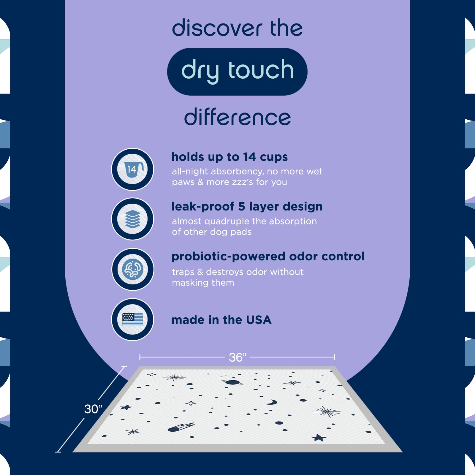 - ALL-NIGHT ABSORBENCY: Wake up to dry floors and dry paws with our XXL Overnight Dog Pads! Whether you are potty training your puppy or your senior dog can't quite hold it through the night, these are the extra extra large dog pads of your dreams. Our super-absorbent, leak-proof performance material holds up to 12 cups of liquid, which is more than enough to last through any midnight bathroom trips by your pup. Still, if you have a large-sized dog, we recommend placing two pee pads next to each other for a hard-to-miss target, especially when it's dark.