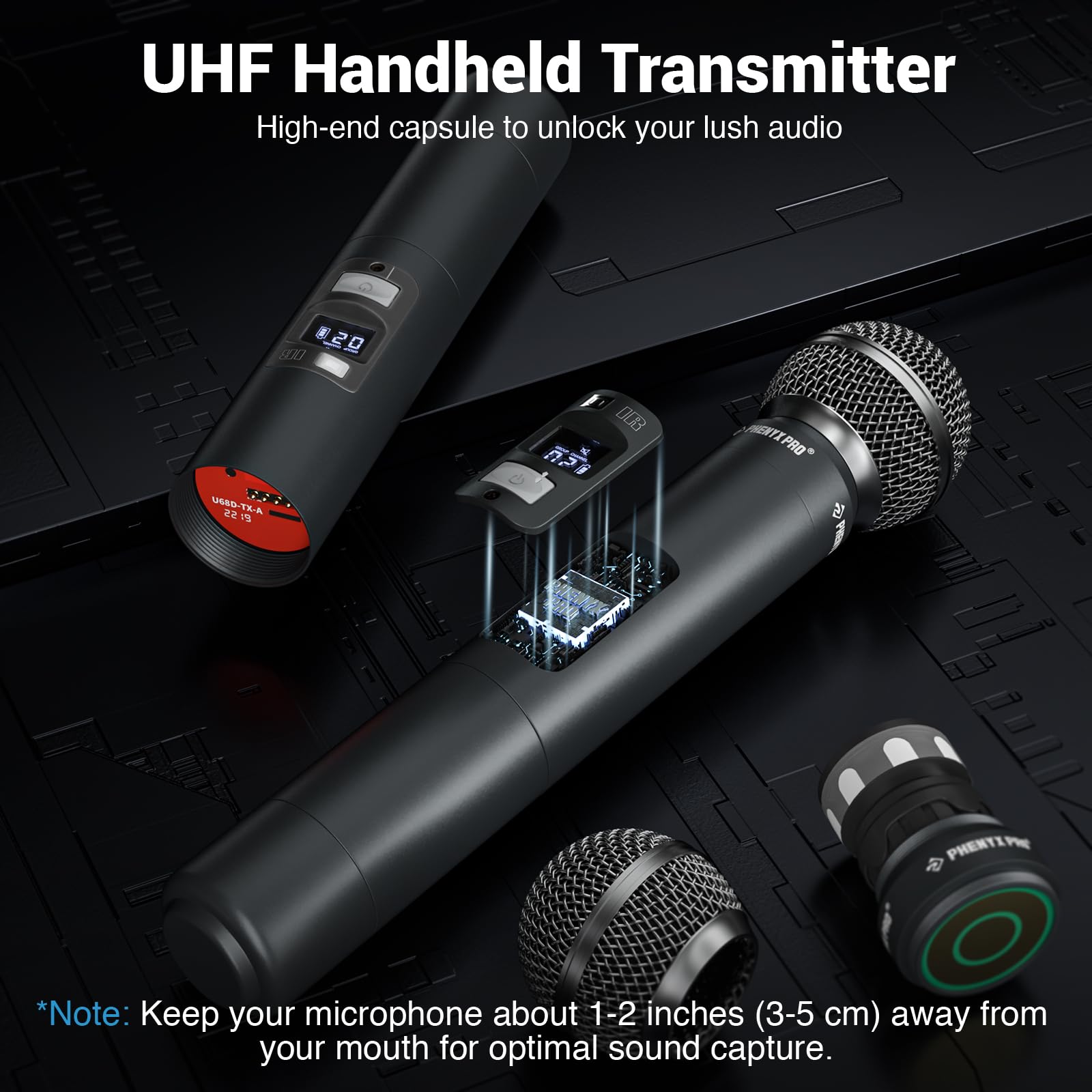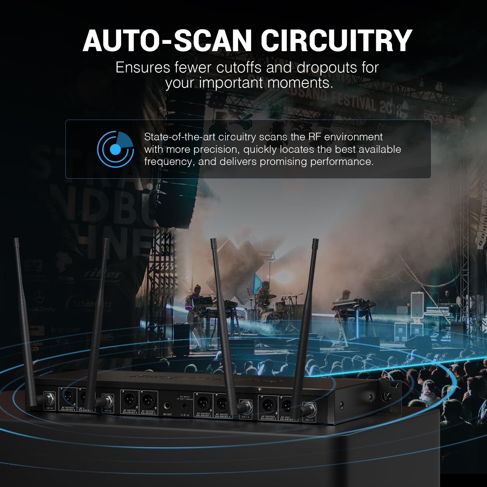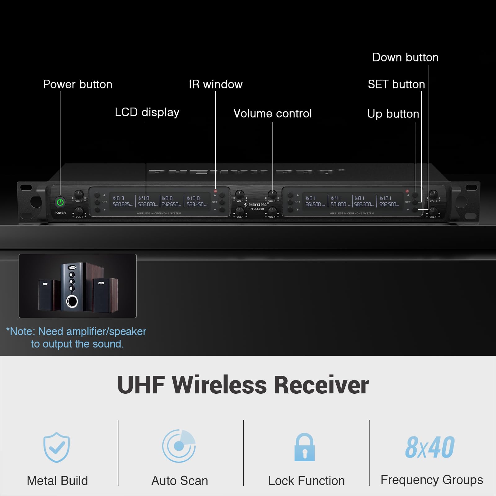 - ENHANCED SIGNAL RELIABILITY: Harnessing the power of Auto Scan, the UHF wireless karaoke microphone system rapidly identifies the least-interference frequency to sync. This advanced feature of the wireless microphone & system increases anti-interference ability and decreases interference between each channel. The wireless DJ microphone system also has lock function to lock selected frequency. 8x40 Selectable UHF frequencies allows multiset operation of up to 16 transmitters simultaneously