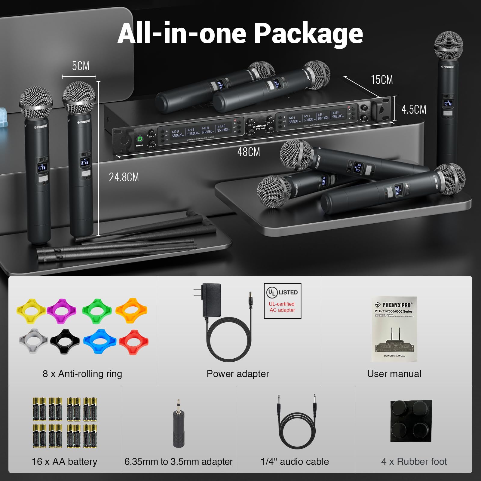 - BOX CONTENTS: 1 x 8-Channel wireless metal receiver for long operation, 8 x UHF handheld microphone wireless,1 x 1/4’’ audio cable, 1 x power adapter, 1 x 6.5 mm to 3.5 mm adapter, 4 x antenna, 8 x anti-rolling ring, 4 x AA battery for 16hrs long hour use, 1 x user manual, 4 x rubber feet. You can conveniently source all necessary components from our store, enabling the quick and efficient setup of your system according to your specific needs