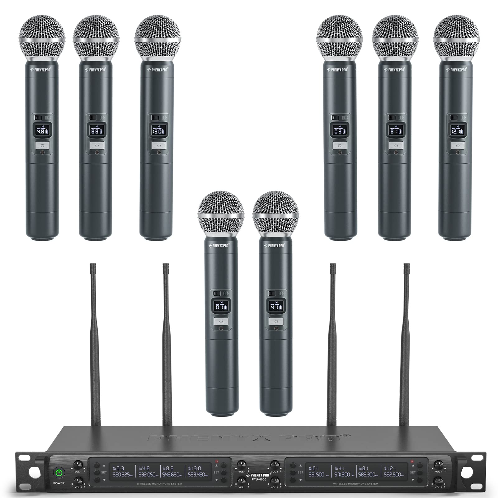 Phenyx Pro Wireless Microphone System, 8-Channel Wireless Mic, w/ 8 Handheld Dynamic Microphones, Auto Scan,8x40 UHF Frequencies, 328ft Range, Mics for Singing,Church, Karaoke(PTU-6000-8H)