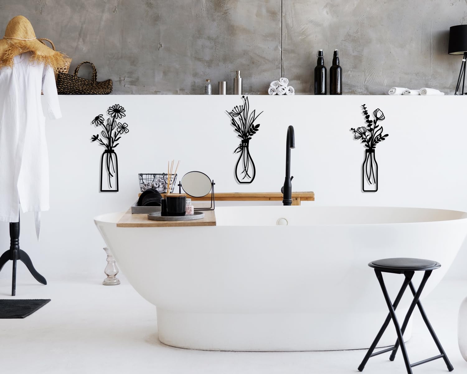 Pigort 3 Pieces Metal Flowers Wall Arts - Rustic Farmhouse Decor Black Minimalist Flower Wall Decors for Living room Bathroom Bedroom Dining Room - Housewarming Gifts(Black, Vase-C)