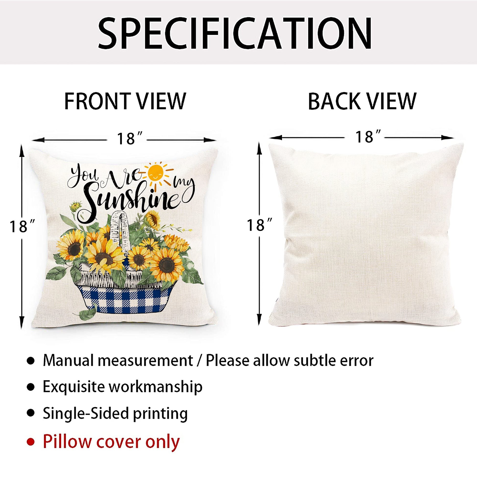 - NOTICE: Including 4 piece 18 x 18 inch sunflower throw pillow covers. Covers only! Please allow 1~2cm deviation because of hand-cutting and sewing. These blue decorative throw pillows's pattern is only on the front side