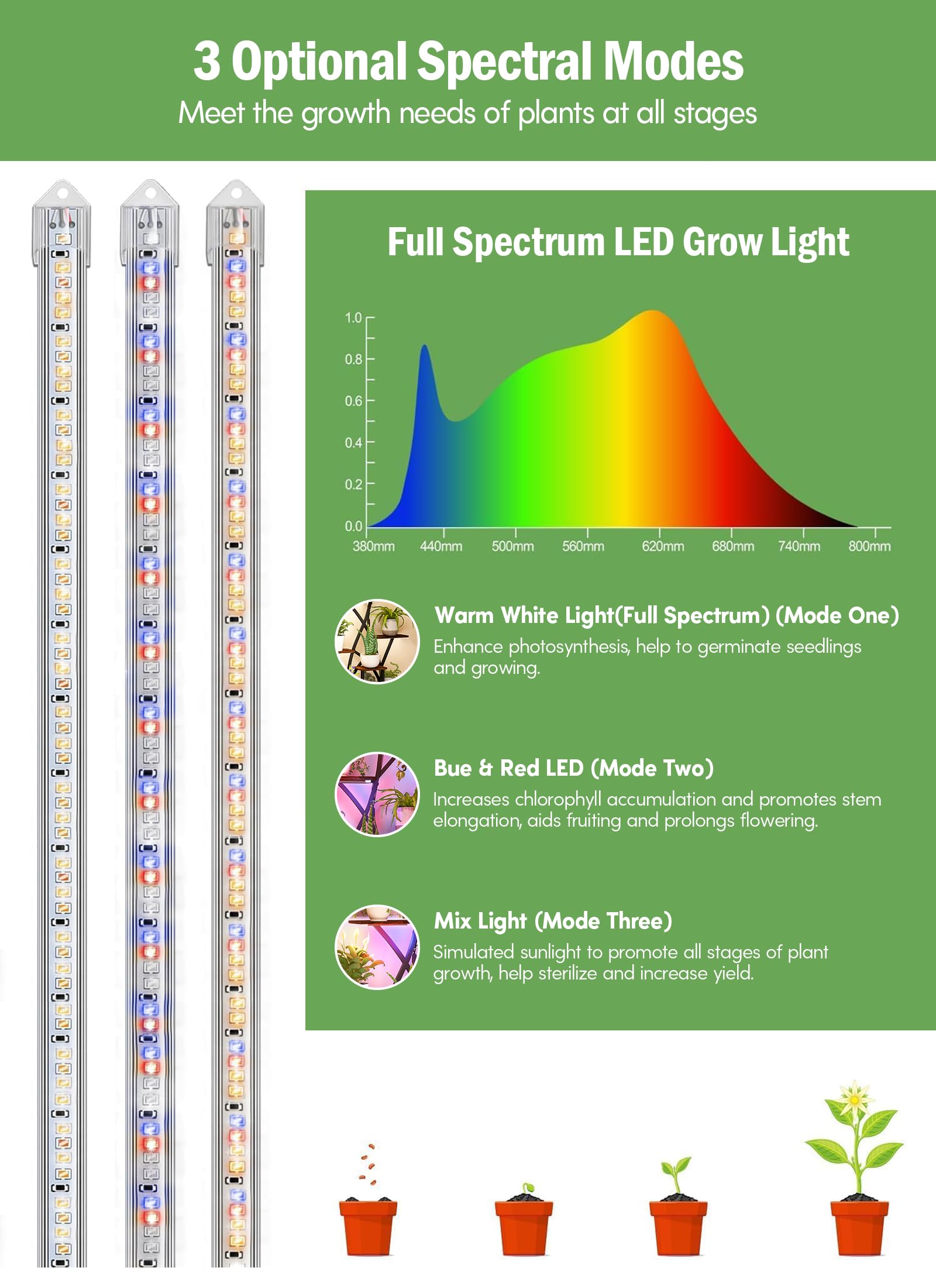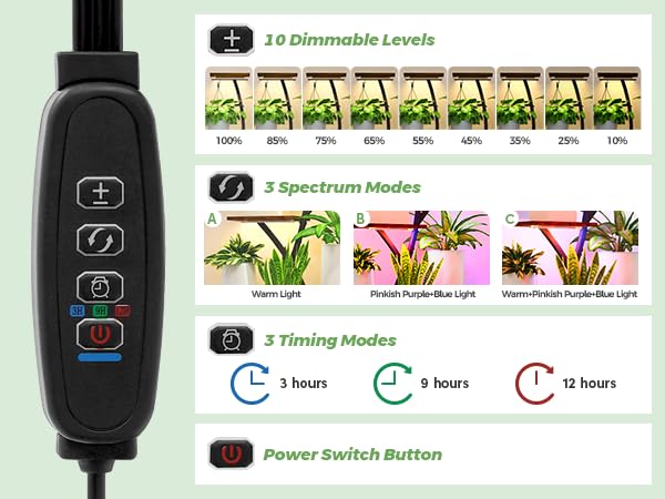 - 【Plant Stand with Grow Light】This plant stands indoor features 5-head with 3 spectrum settings grow lights for indoor growing: warm white (3000K) for natural sunlight simulation, red+blue (660nm+460nm) to boost growth stages, and full spectrum (380nm-780nm) for complete plant development. The timer (3H/9H/12H) and 10 brightness levels ensure optimal lighting for herbs, succulents and flowers without moving plants near windows