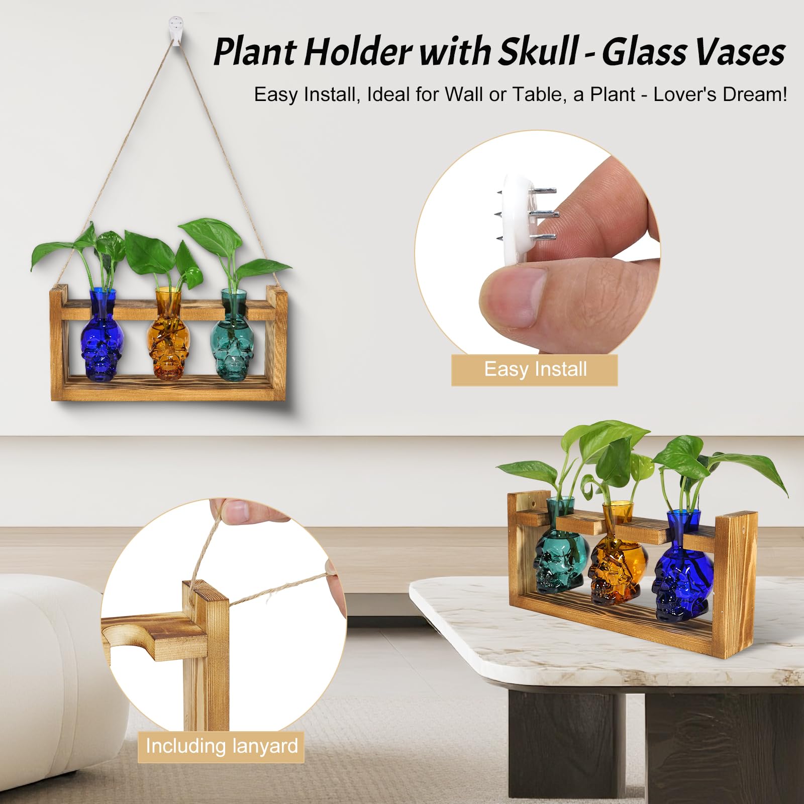 Plant Terrarium Propagation Stations Hydroponics Planter Vase Skulls Decor with Wooden Stand Gift (3*Mixed Color)