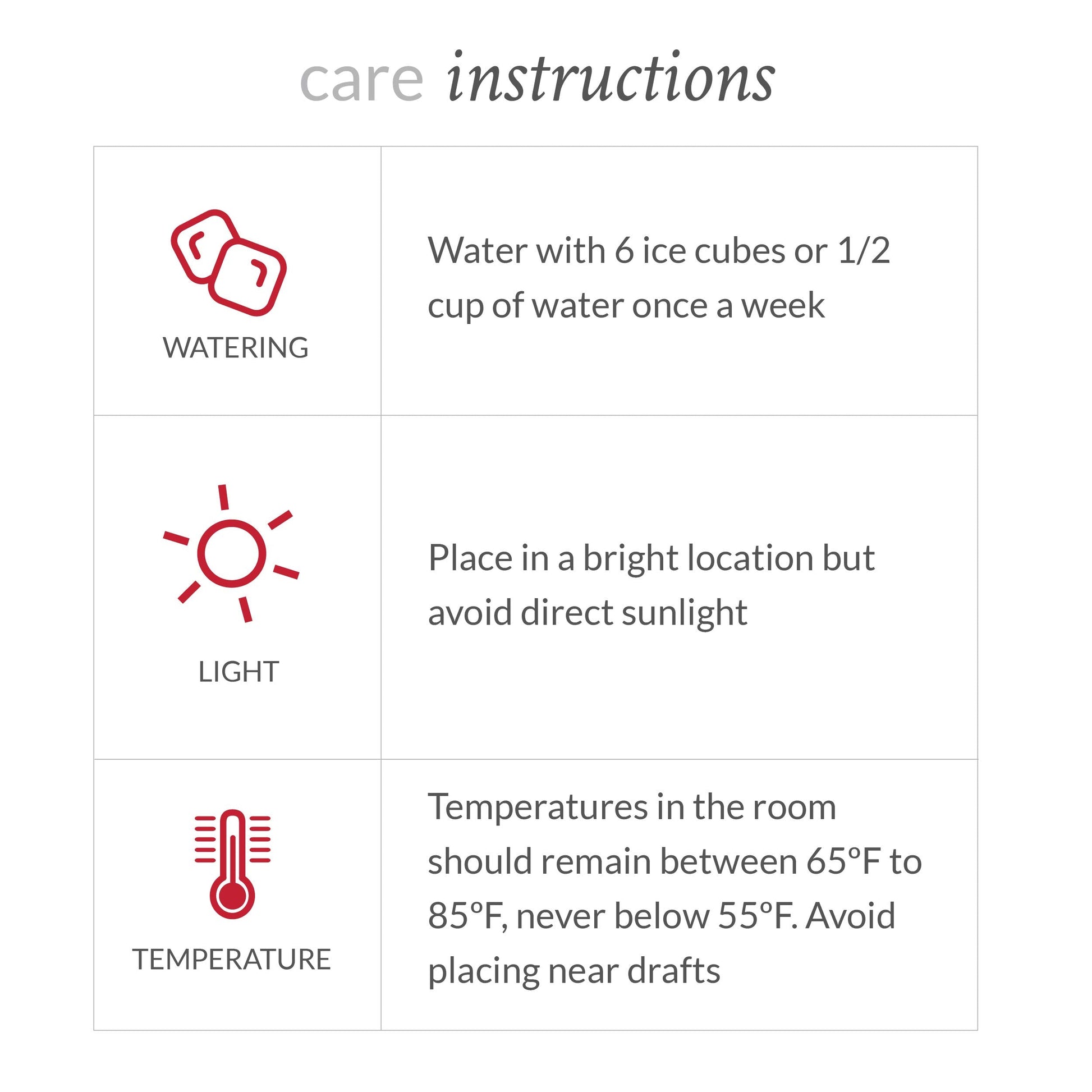 Care Instructions: Water once a week with 6 ice cubes (1/2 cup water). Keep in bright, indirect light. Temperatures in the room should remain between 65 degrees F to 85 degrees F, never below 55 degrees F. Avoid placing near drafts.Just Add Ice grows over 8 million plants each year. We use highly efficient growing techniques, water conservation and a sustainable heat source to ensure that our plants are grown in an environmentally friendly fashion. Our state-of-the-art grading system and advanced packaging methods ensure you always receive the highest quality plants. Just Add Ice orchids are ideal for interior decorating, gifts for all occasions, and even party favors or centerpieces.