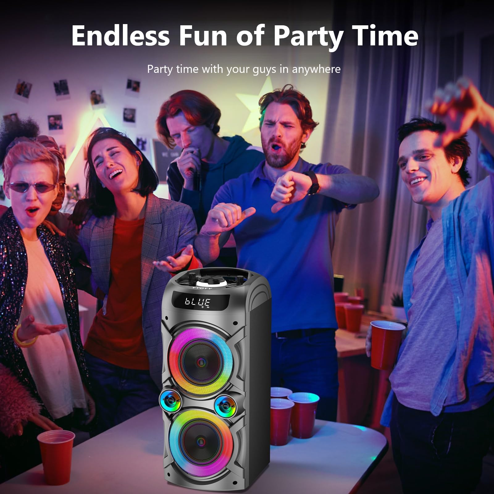 - ♫ 【Bluetooth Speaker with Lights】The A93 Large Bluetooth Speaker is designed with multiple dynamic light modes to light up every corner of the party space, and Colorful Disco LED lights can change the lighting effect according to the rhythm of music, which colourful and vibrant can give your home party, beach, camping or outdoor travel an exciting atmospher. You can easily turn on and off the LED lights with one button.