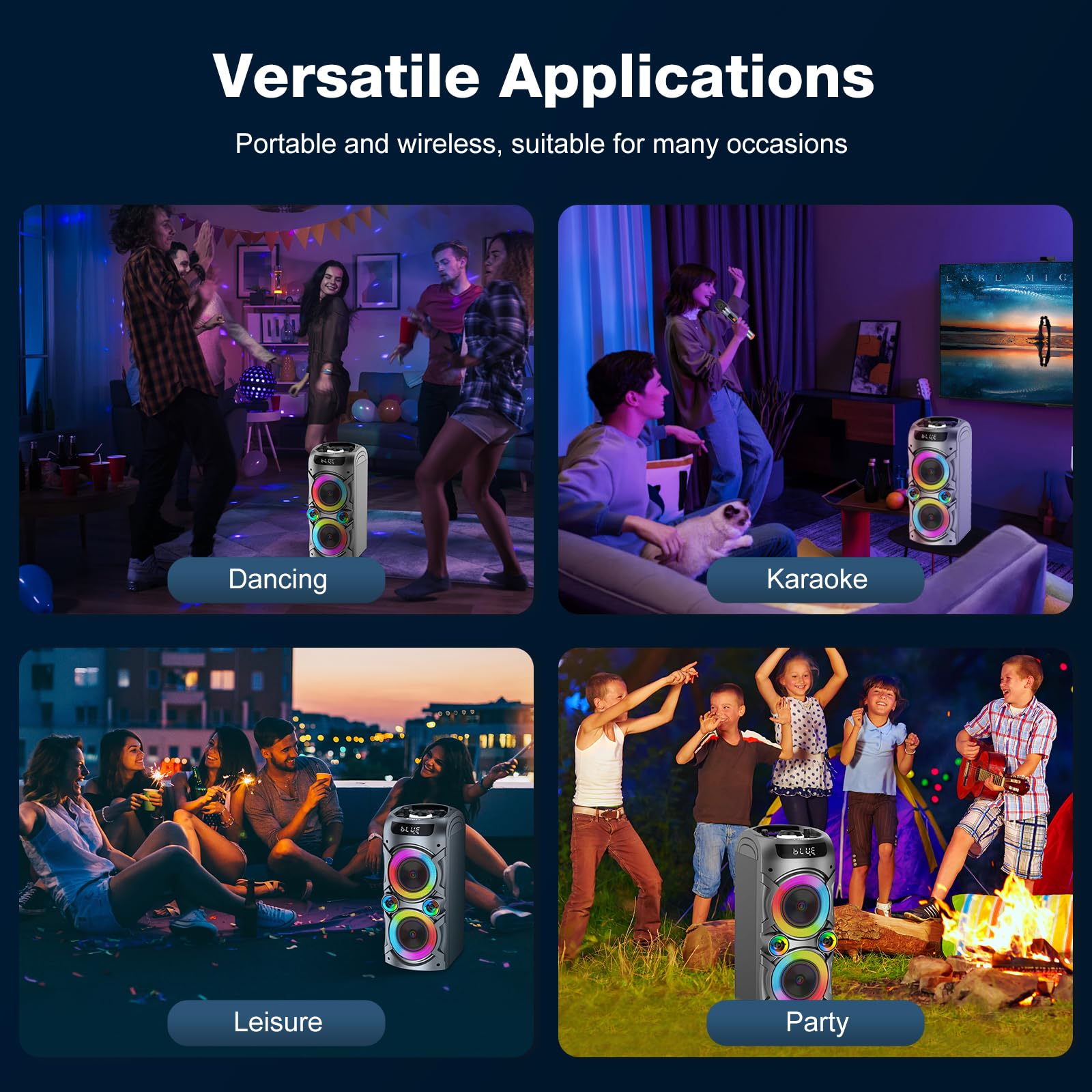 - ♫ 【Multi-function Party Speaker】 The A93 portable bluetooth speaker support TWS, TF Card music playback, AUX input, U-disk music playback, and 6.35MM Microphone jack. It's built-in 10800mAh rechargeable battery, providing up to 6~12 hours play time ( depends on playing volume). You can enjoy the carnival whether it is an indoor or outdoor dance party. This big bluetooth speaker is great for camping trips, barbecues and even singing karaoke, weddings, conferences etc.