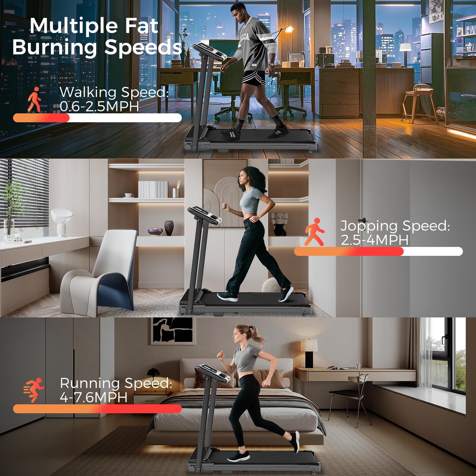 - 【3.0HP Powerful Motor and Quiet Operation】This treadmill with handle is equipped with a 3.0HP powerful motor with a weight capacity of up to 300lbs. Greatly ensures stable operation of the treadmill.The sturdy treadmill allows you to exercise at 0.6-7.6MPH speed is very quiet.you can work out anywhere without worrying about disturbing yourself or others.