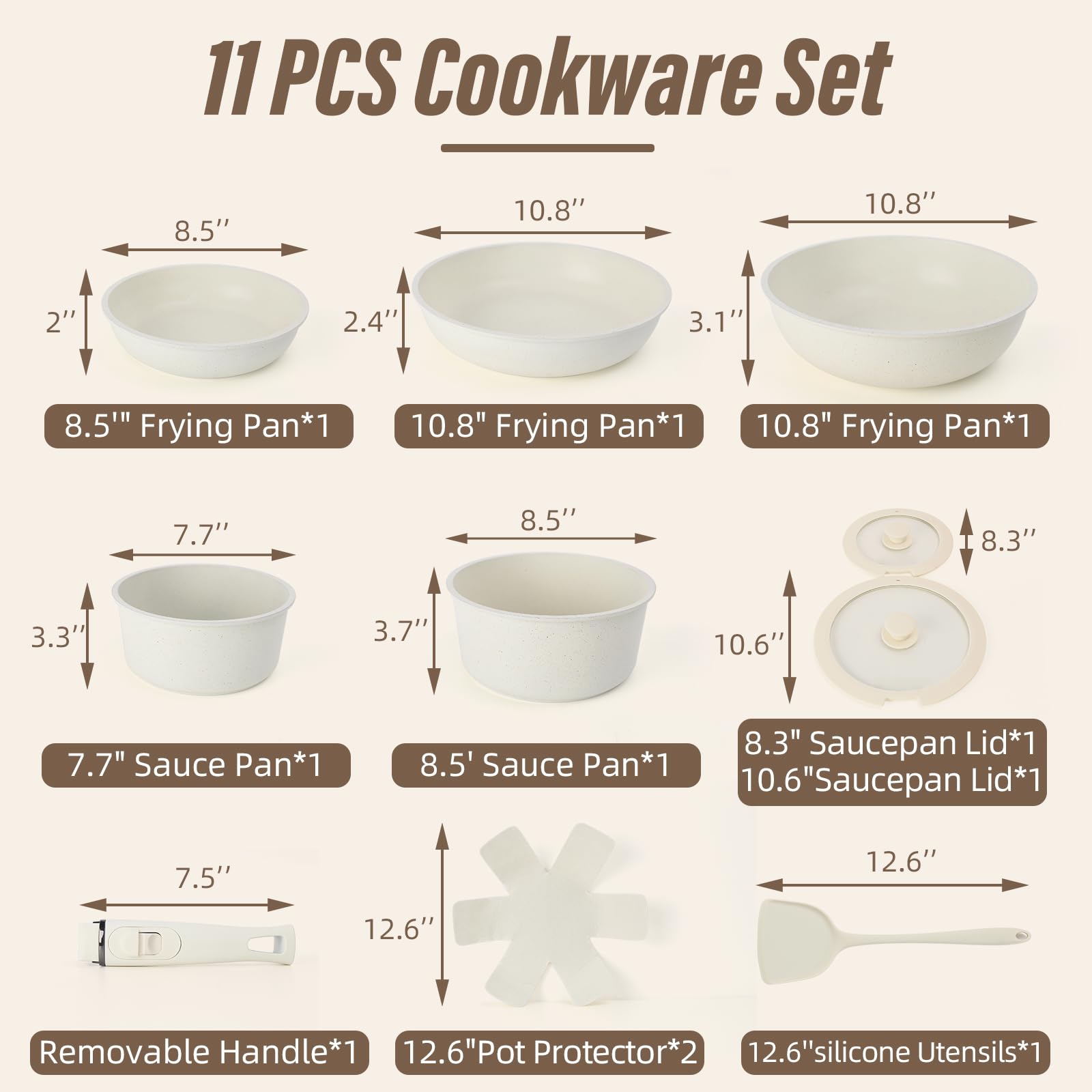 Pots and Pans Set Non Stick, 11 PCS Pan Set With Removable Handles, White Cookware Set Suitable for Induction Cooktops/Gas Stoves/Microwave Ovens