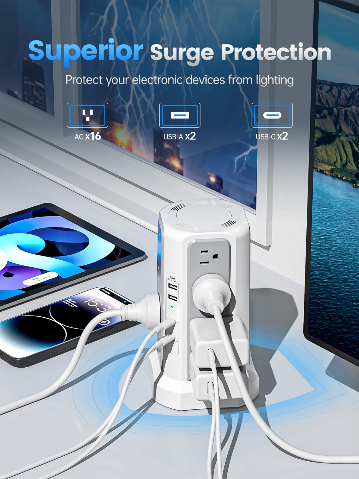 - 20-in-1 Surge Protector Power Strip Tower:Equipped with 16 AC outlets and 4 USB ports (including 2 USB-C), this 6-foot extension cord with multiple outlets serves as an ideal solution for office supplies and desk accessories, allowing you to simultaneously power up to 20 devices.It is the ideal solution when you're away from traditional outlets or need a charging station for multiple devices