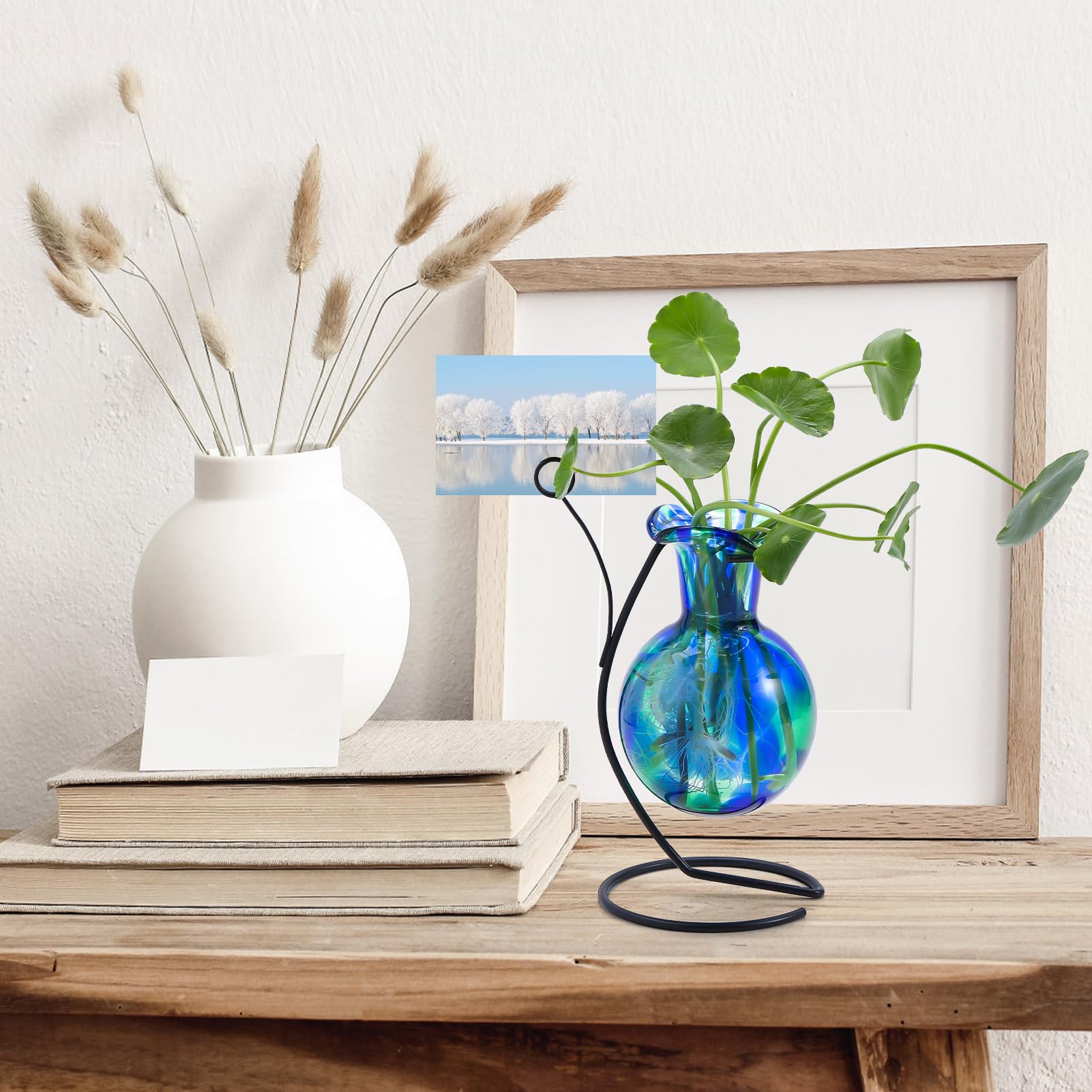 Pozfun Hand Blown Glass Plant Propagation Station with Metal Stand and Photo Holder,Tabletop Plant Terrarium for Propagating Hydroponic Office Garden Home Decor, Gifts for Women Plant Lover