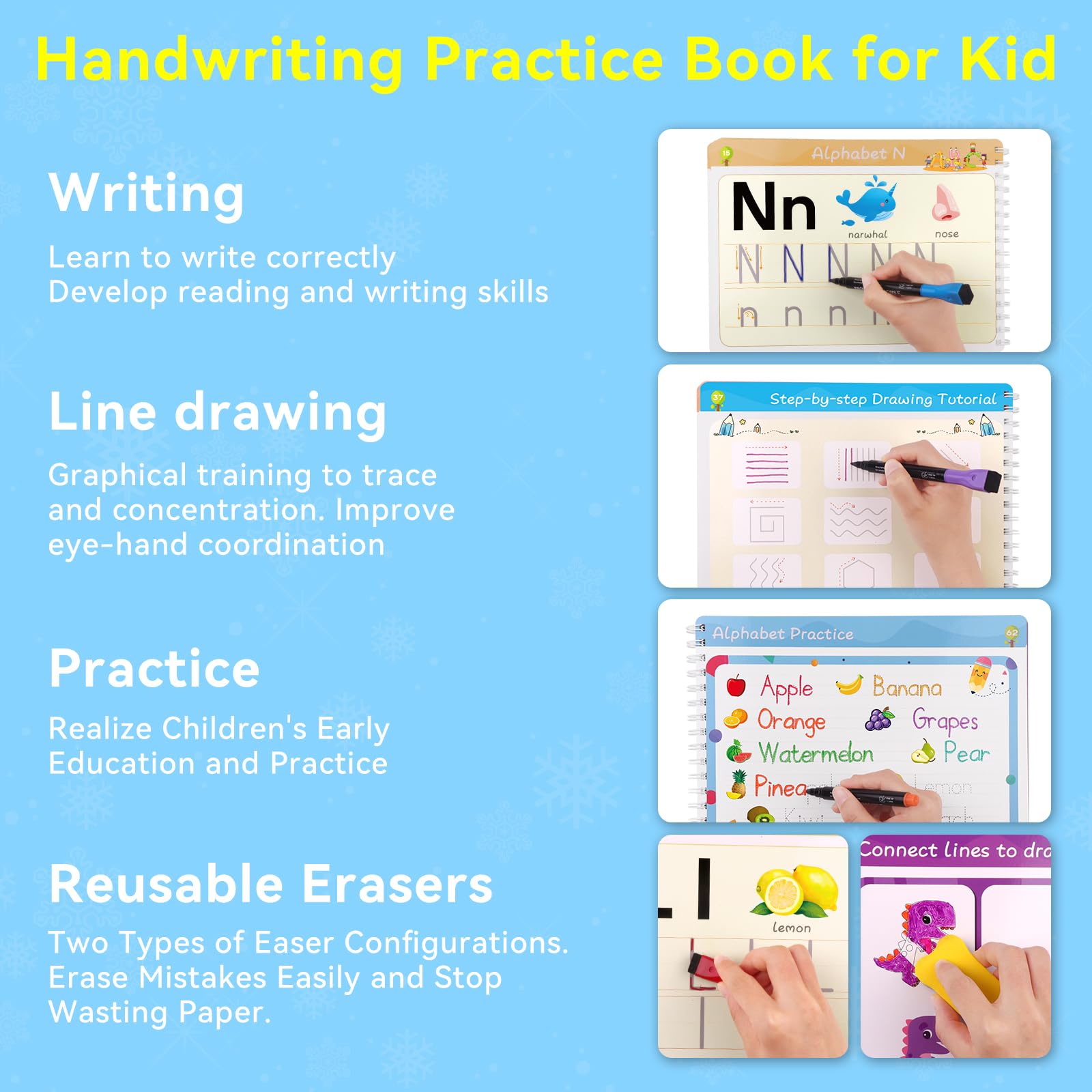 - ✍️FUN & EASY EDUCATIONAL TOYS : Our preschool workbook come with a nice gift box. Contains 64 pages of preschool learning activity, 12 markers and 2 eraser. This preschool handwriting practice book is multi-functional, allowing kids to develop fine motor skills, communication, verbal and problem-solving skills, and improve basic hand-eye coordination, imagination, and visual perception. Perfect for toddler learning activities for toddlers. Also is useful as a busy or quiet book.