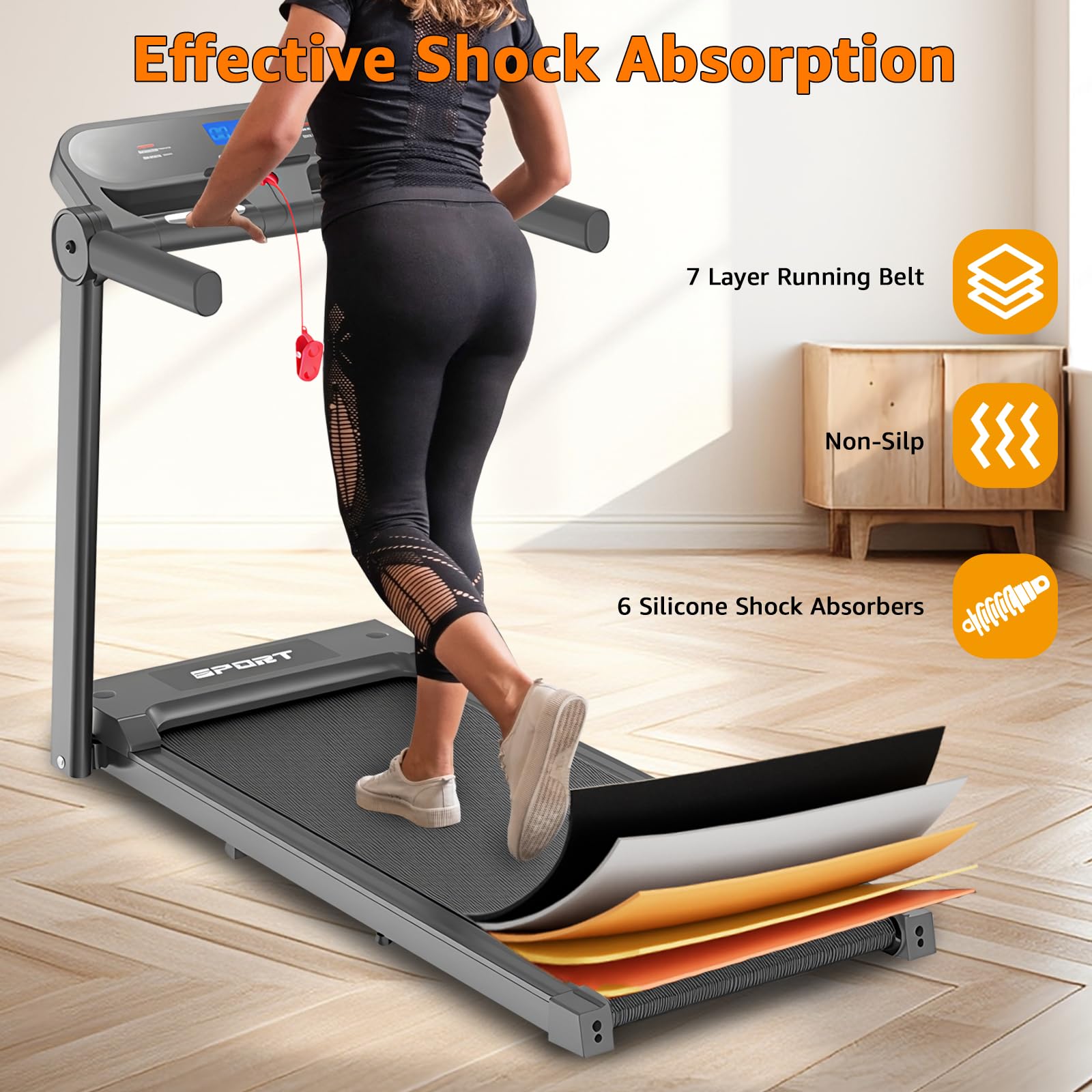 - 7-layer running belt & multi-layer shock absorption: This treadmill is equipped with 6 shock absorbers at the bottom, providing excellent cushioning performance, reducing impact on joints, allowing you to experience a smooth and comfortable workout experience. The multi-layer shock absorption system ensures a more stable running experience, and the running belt will not shift, making it an ideal choice for users who exercise for a long time or have joint problems.
