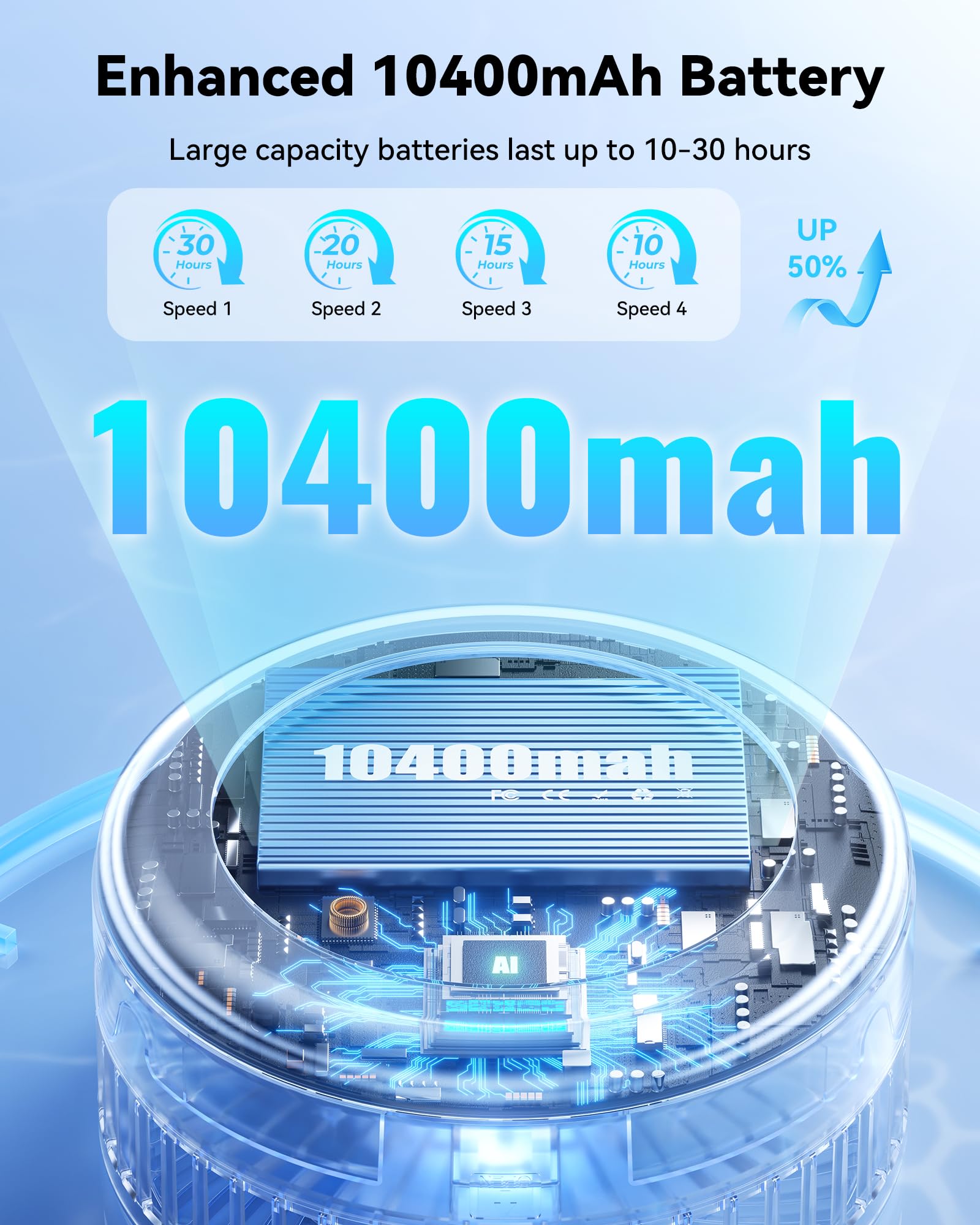 - 10400mAh Large Battery: This battery operated fan runs on 10400mAh large capacity, 8 hours full-charged, ensures 10-30H of cooling relief without outlets, 4-speed, working time depends on different speed and oscillation. Note: please charge before first use