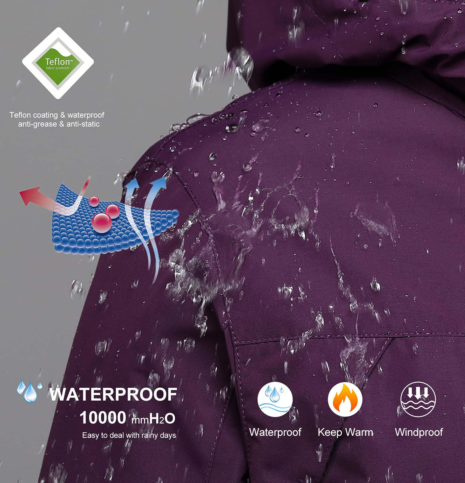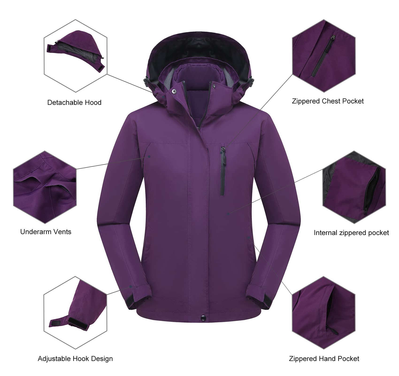 - Windproof & Waterproof - The shell jacket women is made with anti-water, grease, and 100% 75D*150D polyester fabric with 10000mmH2O waterproof index. This windproof waterproof designs of this womens 3 in 1 ski jacket features with a detachable hood, adjustable drawstring, elastic cuffs, and YKK zippers. It's worth noting that the womens jacket Will effectively seals warmth while keeping you security from ice cold gusts of wind.