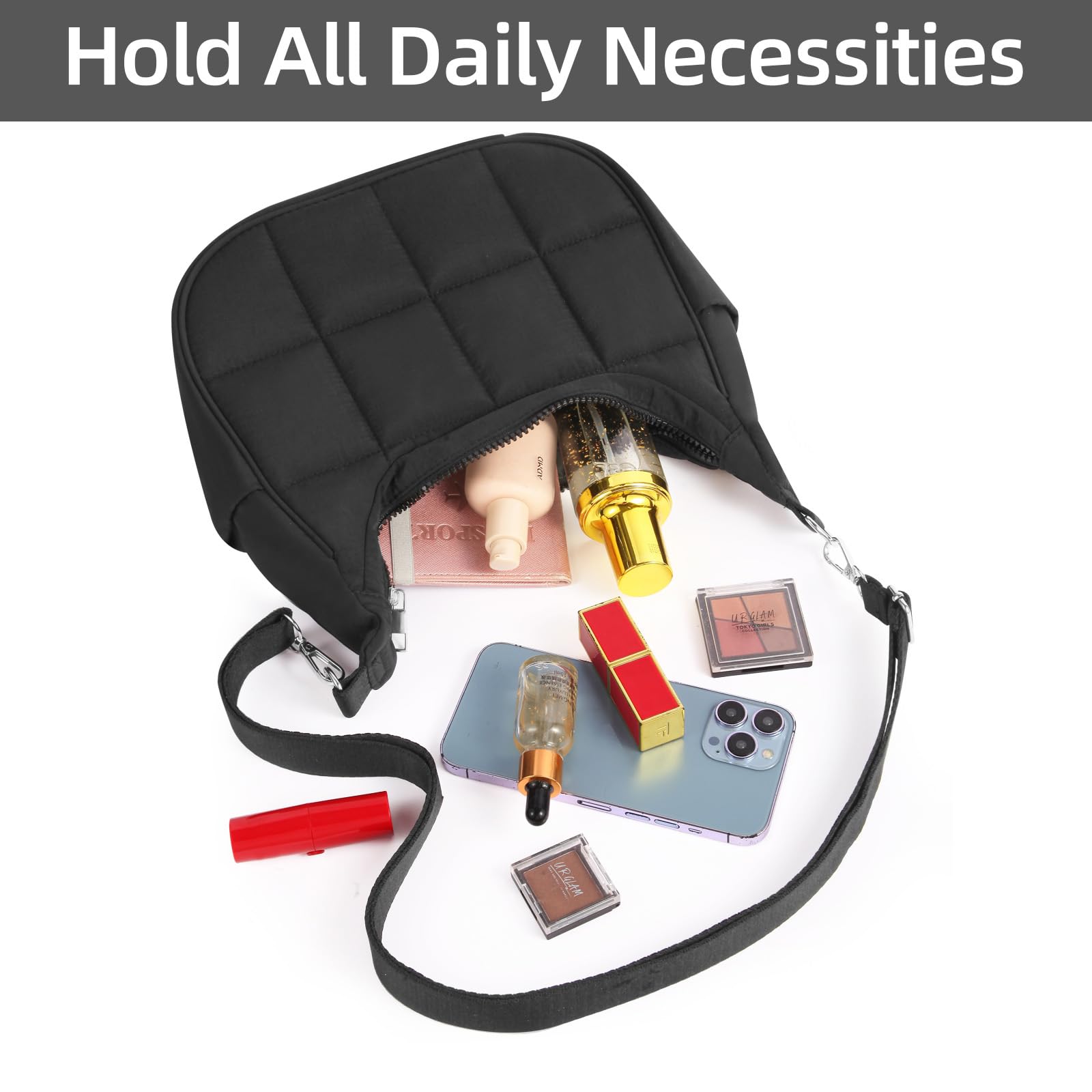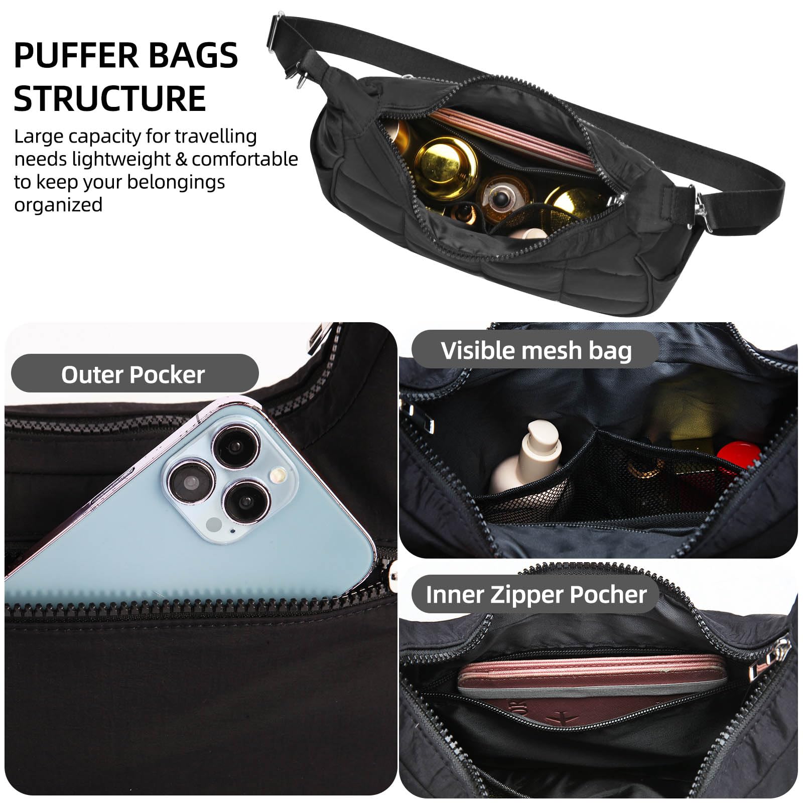 Puffy Crossbody Bags for Women, Small Puffer Crescent Shoulder Bag, Nylon Quilted Purse for Women with 2 Straps (Black)