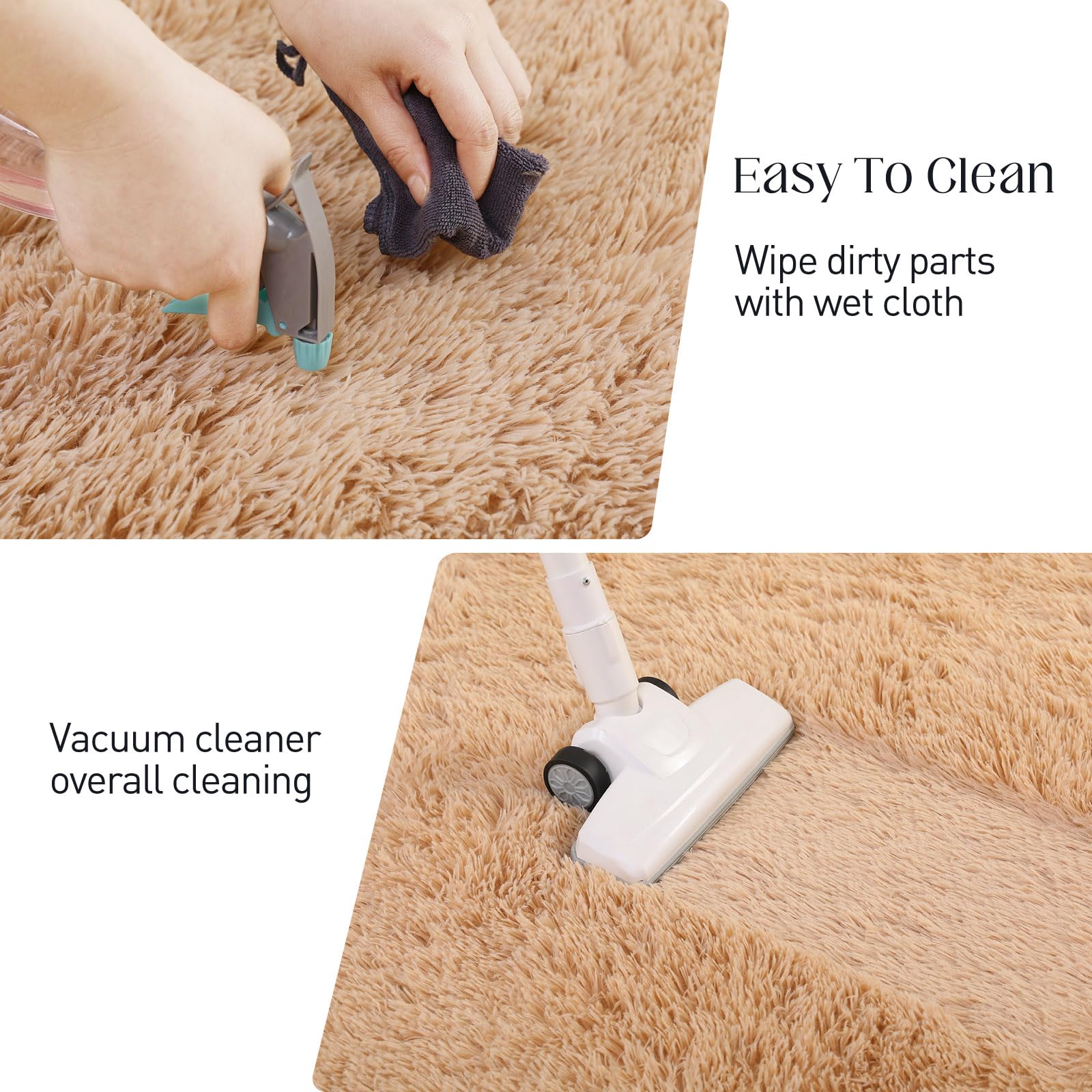 - How to Clean: We recommend spot cleaning stains on the shag rug using a damp cloth or hand washing. For regular maintenance, use a vacuum cleaner to remove food residues and dust from the surface of the plush rugs. While machine washing is option, it may reduce the lifespan of the living room rug. Therefore, we prioritize and suggest wash by hand as the preferred method