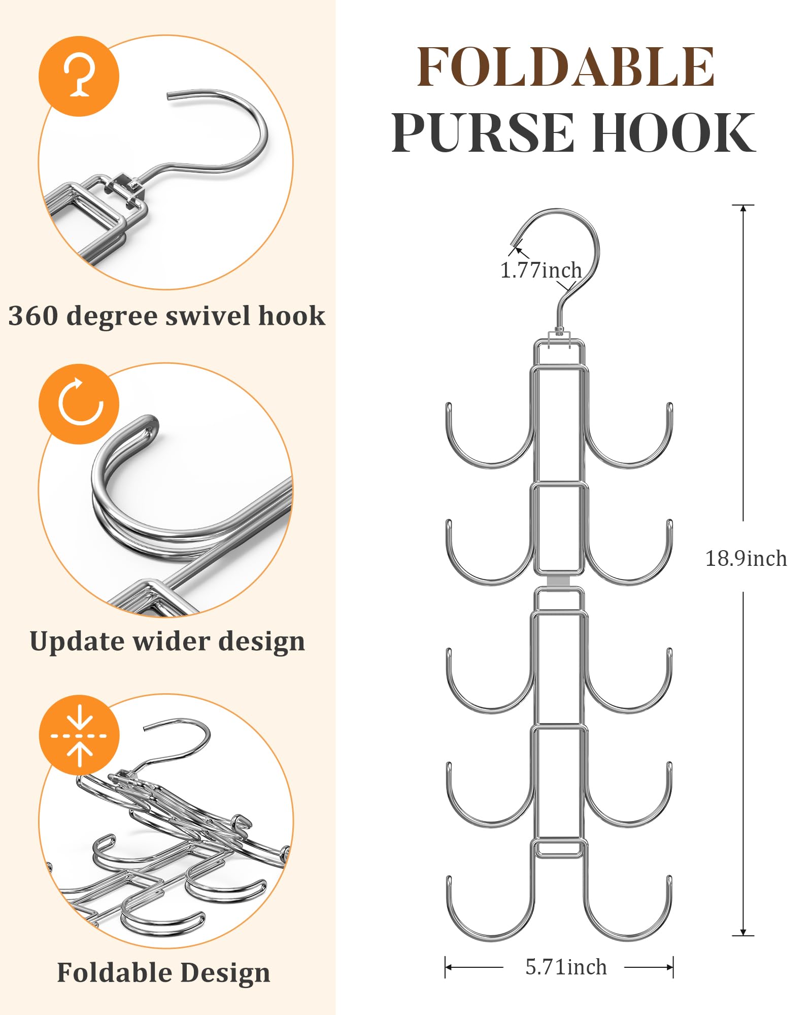 Purse Hanger for Closet, 360 Degree Purse Organizer with 10 Hooks Bag Handbag Hanger Hooks for Purse Hanging, Durable Purse Display Rack Space-Saving Bag Organizer for Women