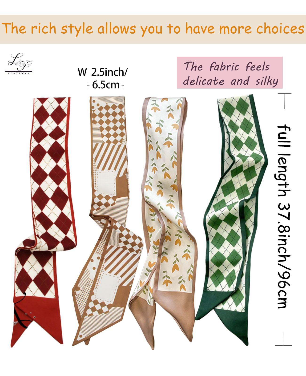 - 【size information】It measures 37.8(96cm) inches long and 2.6(6.5) inches wide,6 packs of different styles of scarves in just the right size to be used as handbag scarves, headband scarves, or women's scarf belts