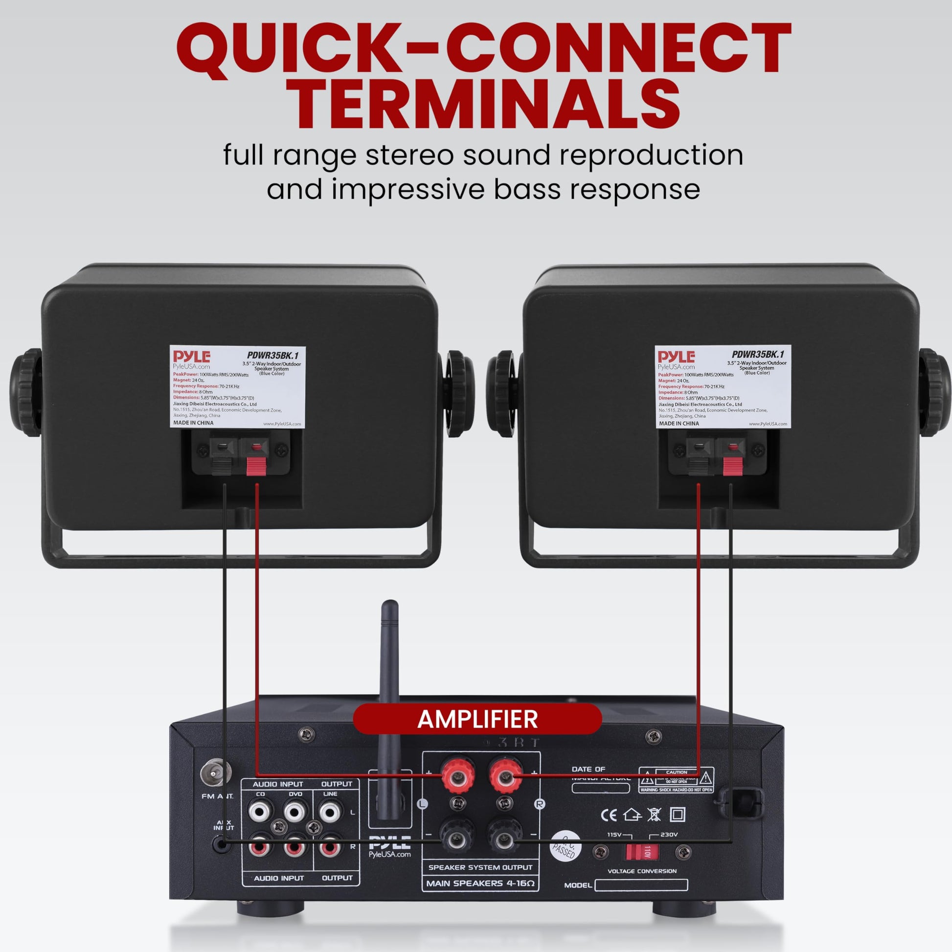 - QUICK-CONNECT TERMINALS: The indoor and outdoor speaker system features a capacitor crossover network that separates 2 channels for a discretely brilliant sound. Connect wires easily using the quick connect / disconnect speaker terminals