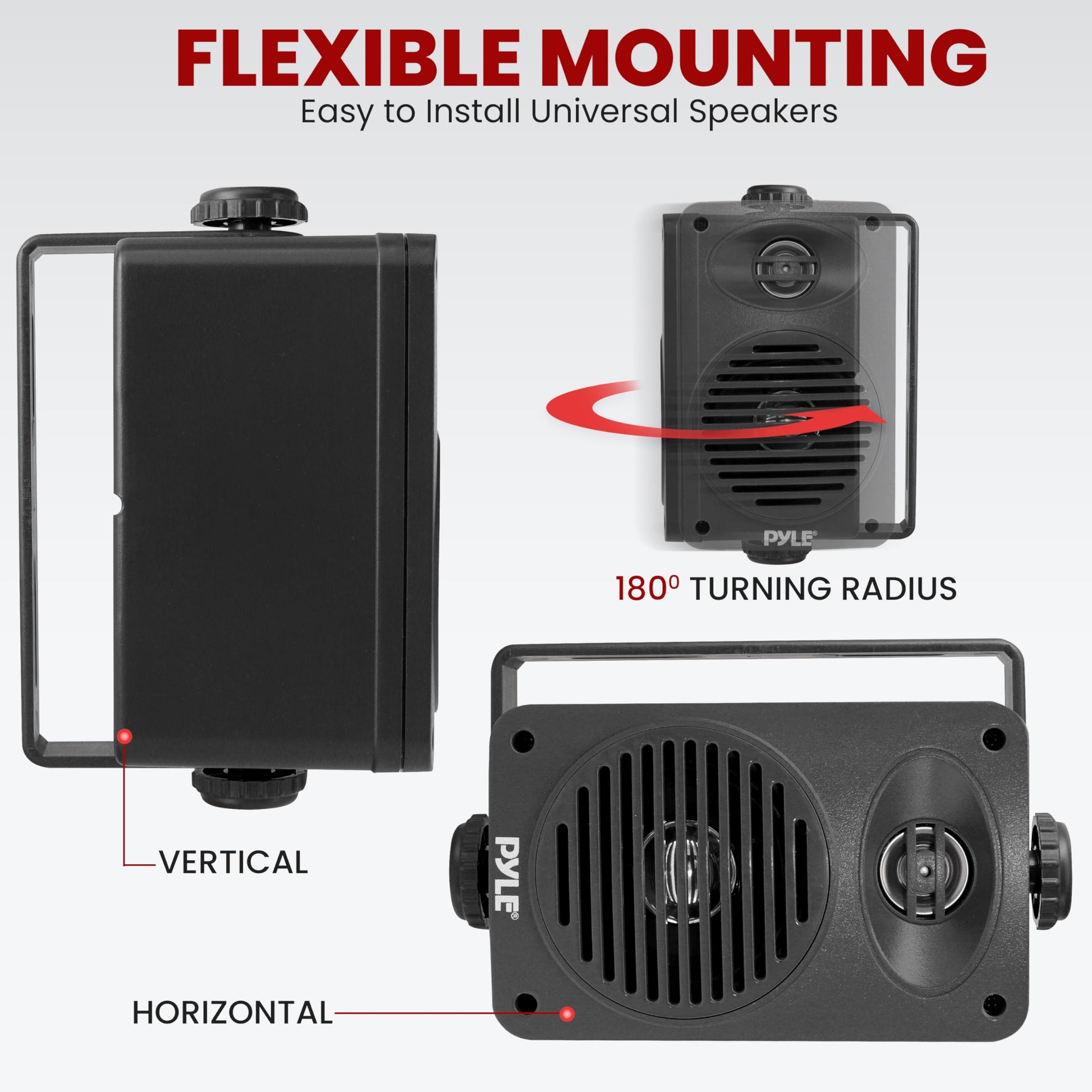 - UNIVERSAL MOUNTING: This all weather outside speakers can be mounted either horizontally or vertically. The set includes (2) speakers, mounting brackets, mounting hardware, and a speaker cable