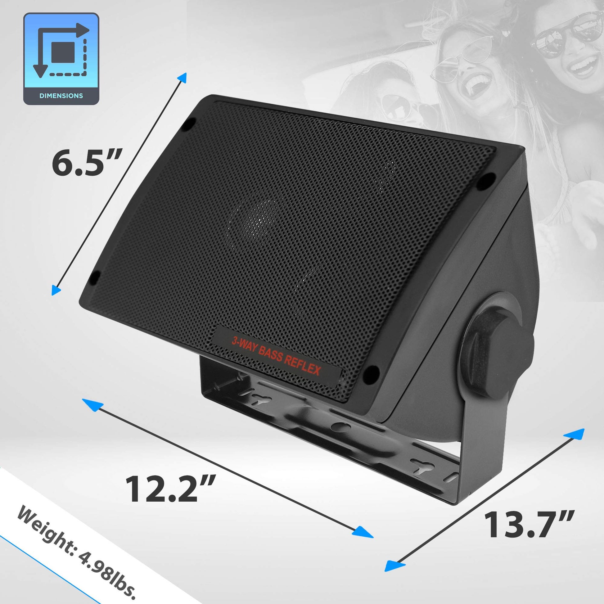 Details: Bass Reflex Speakers 3 Way Speaker System ABS Sealed Plastic Enclosure 3 1/4-Inch Woofer/2-Inch Midrange/1-Inch Tweeter 200 Watts Peak Power Frequency Response: 70-21kHz SPL: 94dB 4 Ohm Impedance Complete Mounting Kit & Wires 71/4-Inch W x 41/4-Inch H x 51/4-Inch D
