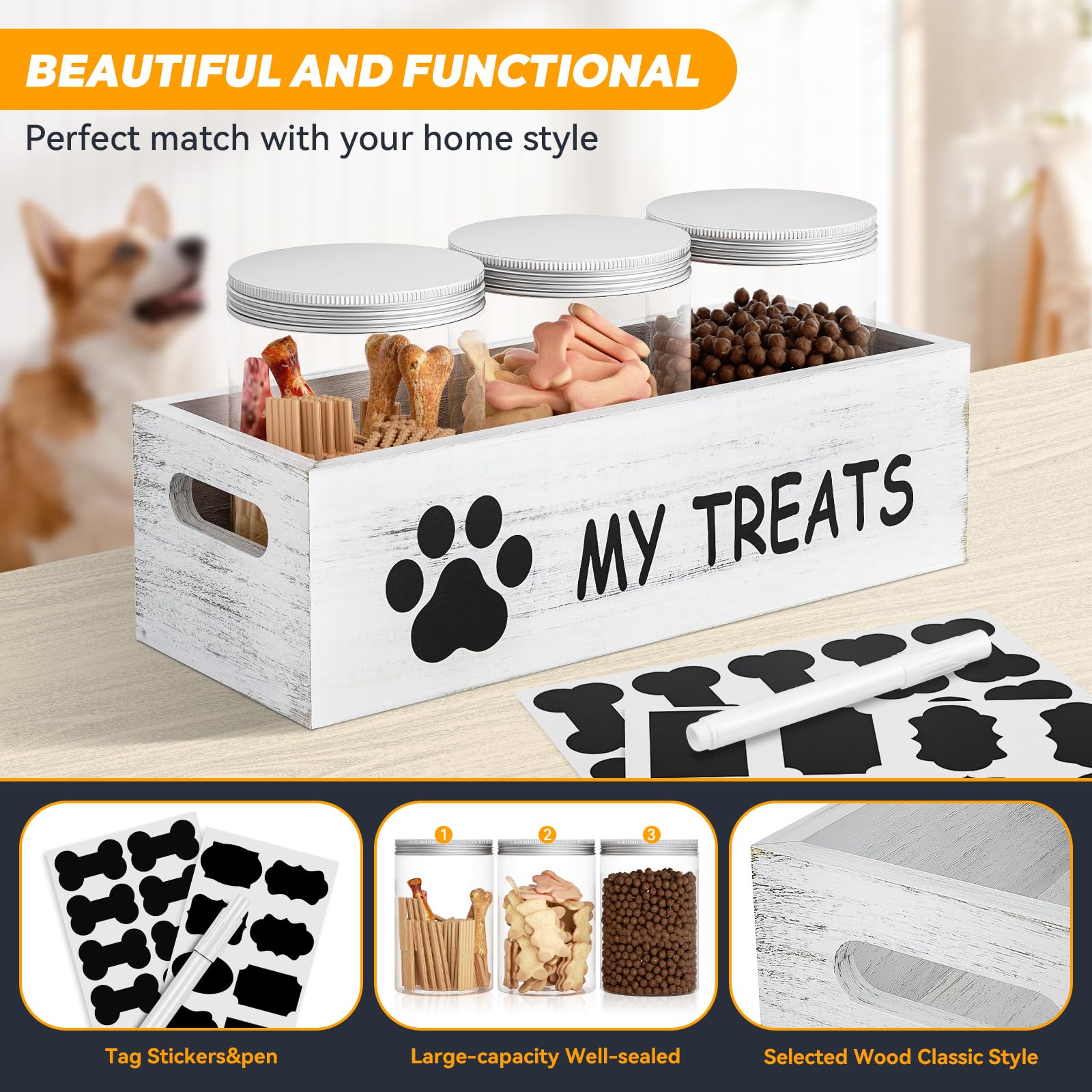 qeerable Dog Treat Container for Countertop - Dog Food Storage with 3 Jars - Pet Food Organizer For Puppy - Airtight White Wooden Dog Treat Storage With Lids - Great Gift for Pet Dog Owners