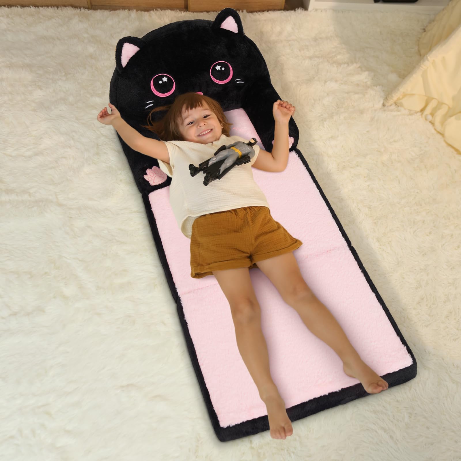 QIUODO Kids Couch Fold Out, Velvet 2-in-1 Flip Open Couch for Toddlers, Comfy Toddler Chair for Reading and Napping, for Boys and Girls (Black & Pink Kitty)