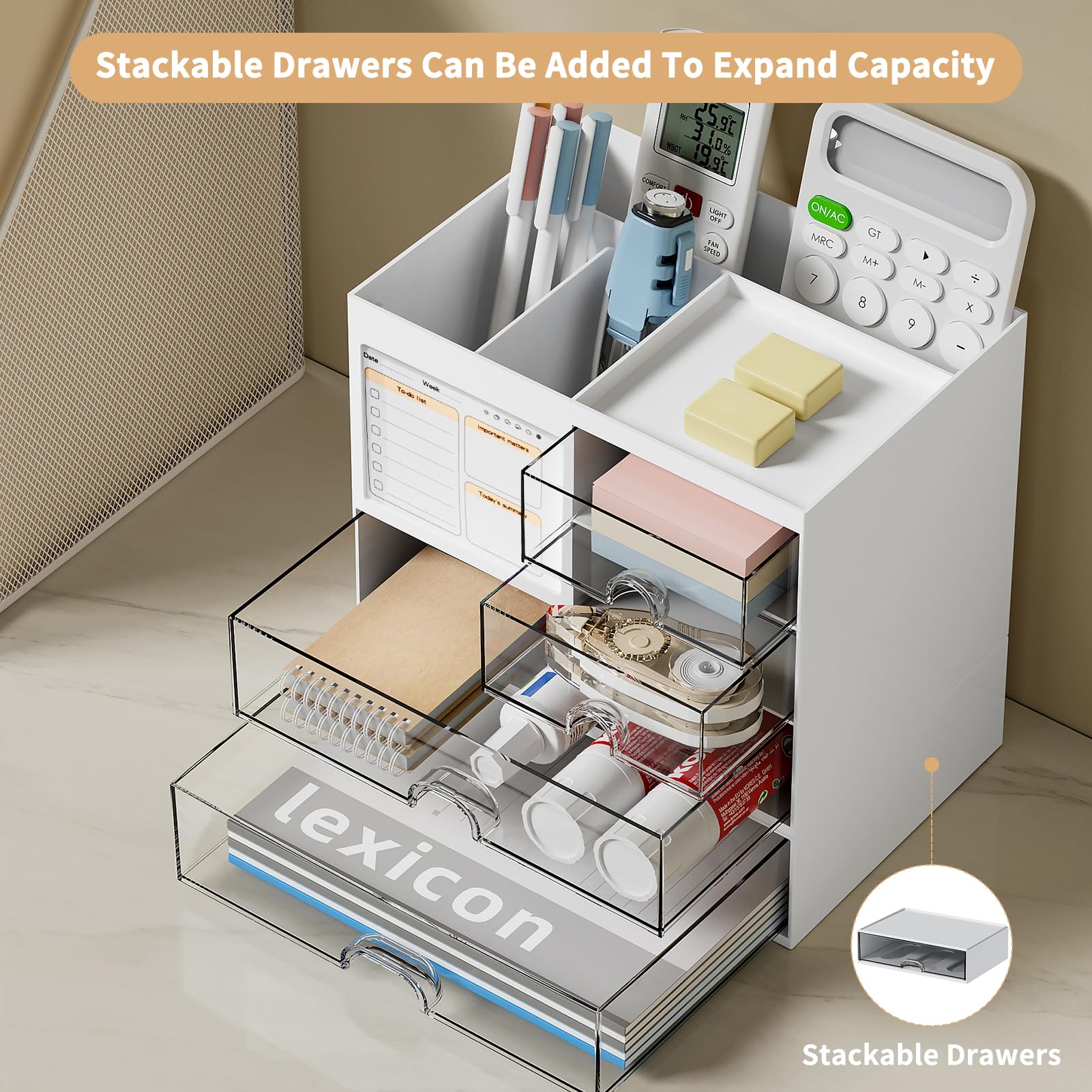 - ✏️【Versatile Design】The desk organizer offers ample storage space with 2 pen holders, 1 top tray, 1 notebook holder, 1 note slot, 2 drawers, and 1 large drawer. It provides enough capacity to organize and categorize your office supplies, allowing for a clean and tidy workspace. Upgraded larger size of 8.18*5.62*6.1 inches offers more storage space.
