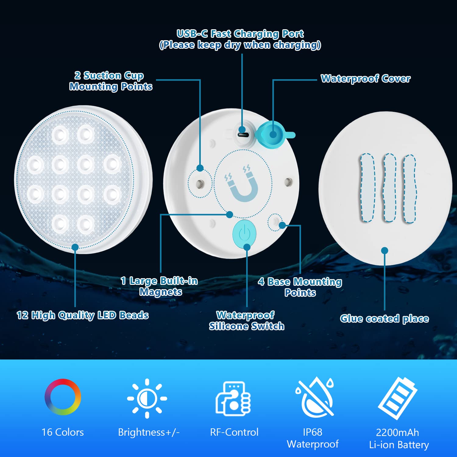 QOLNBY Rechargeable Pool Lights Submersible LED Lights with Remote, IP68 Waterproof Underwater Lights,16 Color Changing Floating Light with Magnet, Suction Cups for Pool,Pond,Party (2-Pack)