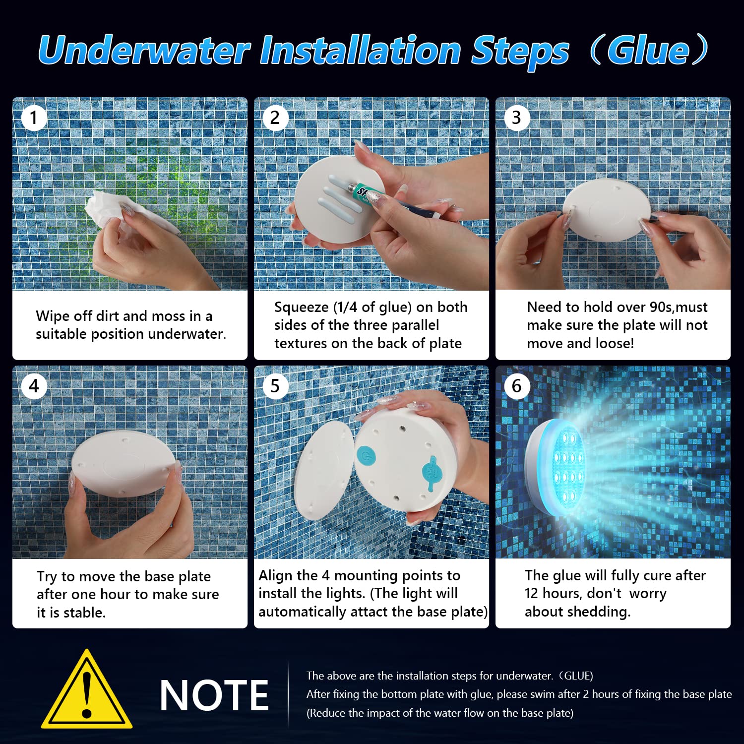 - Suitable for Uneven Surfaces, Supports Gluing Installation: The underwater pool light not only supports the traditional suction cup mounting method (only smooth surfaces), but also offers a glue-on method (smooth or uneven surfaces). The glue can easily be scraped off with a tool, no need to worry about bonding to the pool wall! The glue is safe