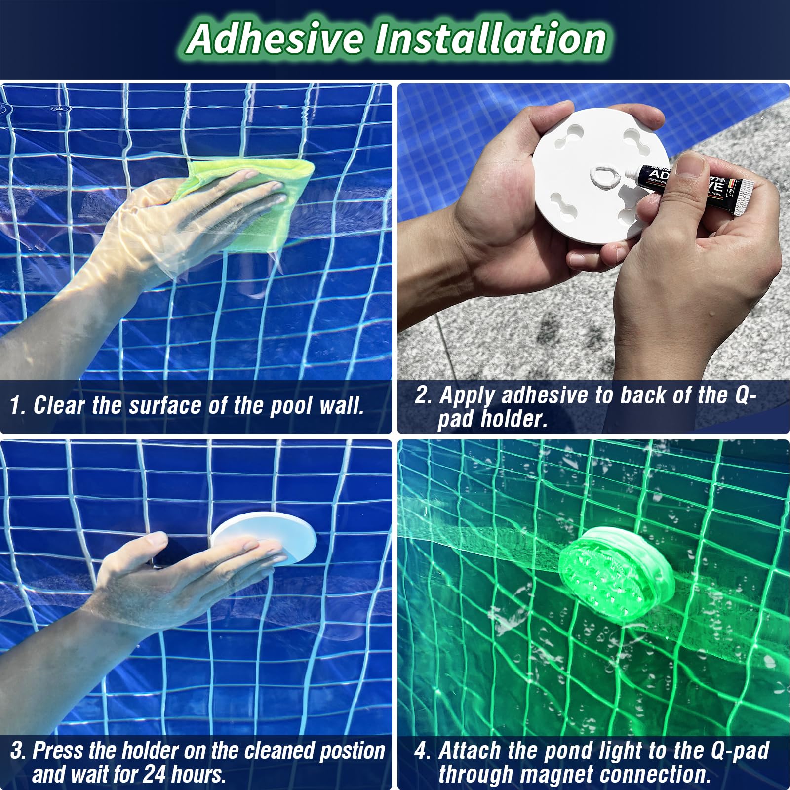 - VERSATILE ATTACHMENT OPTIONS - Our led pool lights boast a remarkable adhesive that can be used in both underwater and dry environments, allowing you to easily glue the base to any surface. Additionally, we provide 4X30mm diameter suction cups that offer strong suction power, perfect for attaching the underwater lights to flat and smooth surfaces like pools or bathtubs. Our pool light with built-in magnet sticks easily to iron surfaces like refrigerators without the need for the base.