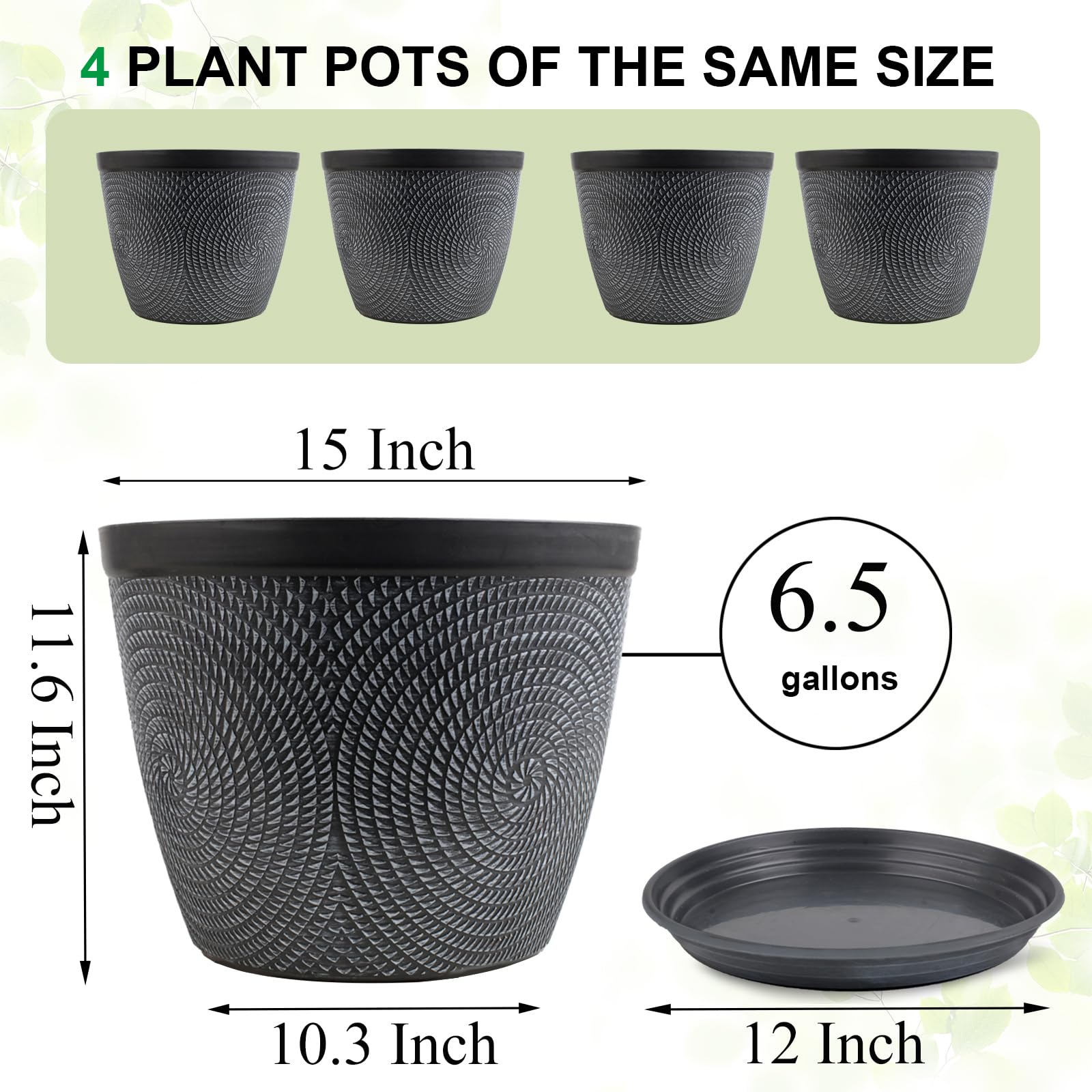 Quarut 4 Pack 15 Inch Large Planter Pot for Plants Outdoor Indoor, Plastic Flower Pots with Drainage Hole & Saucer, Modern Decorative Medium Large Plant Garden Pot, Plant Container for House (Gray)
