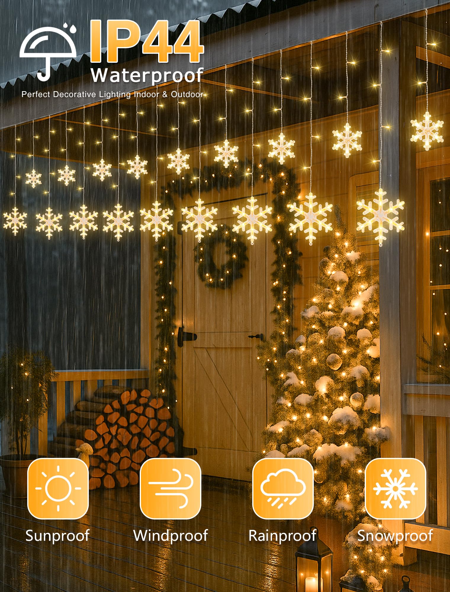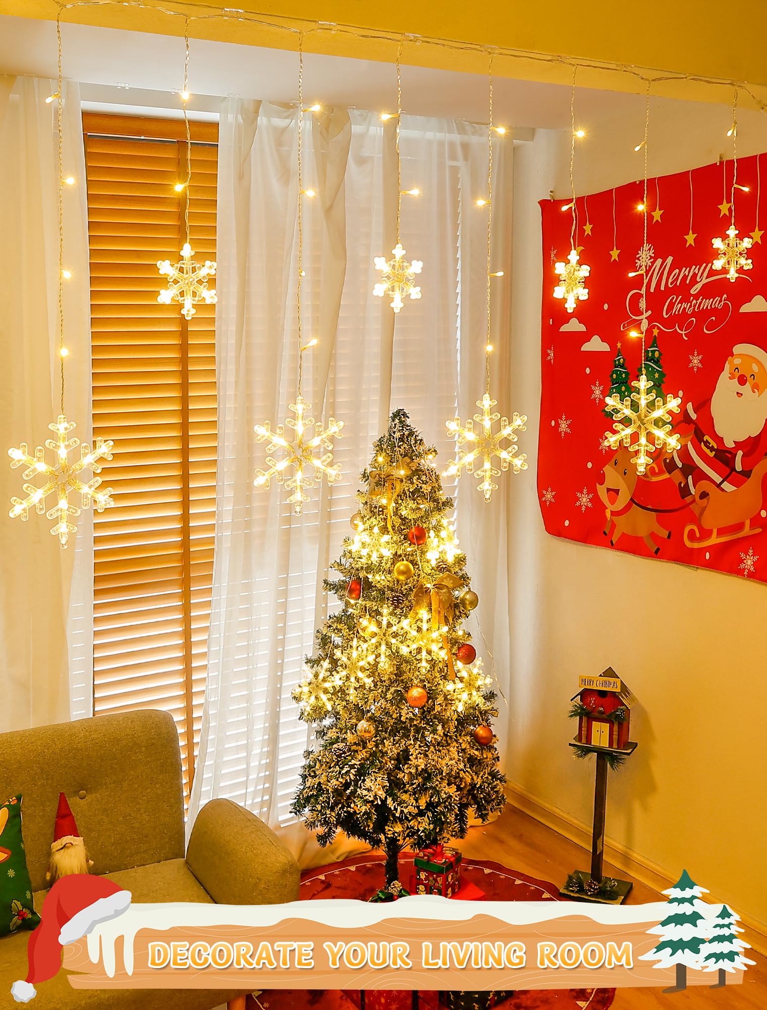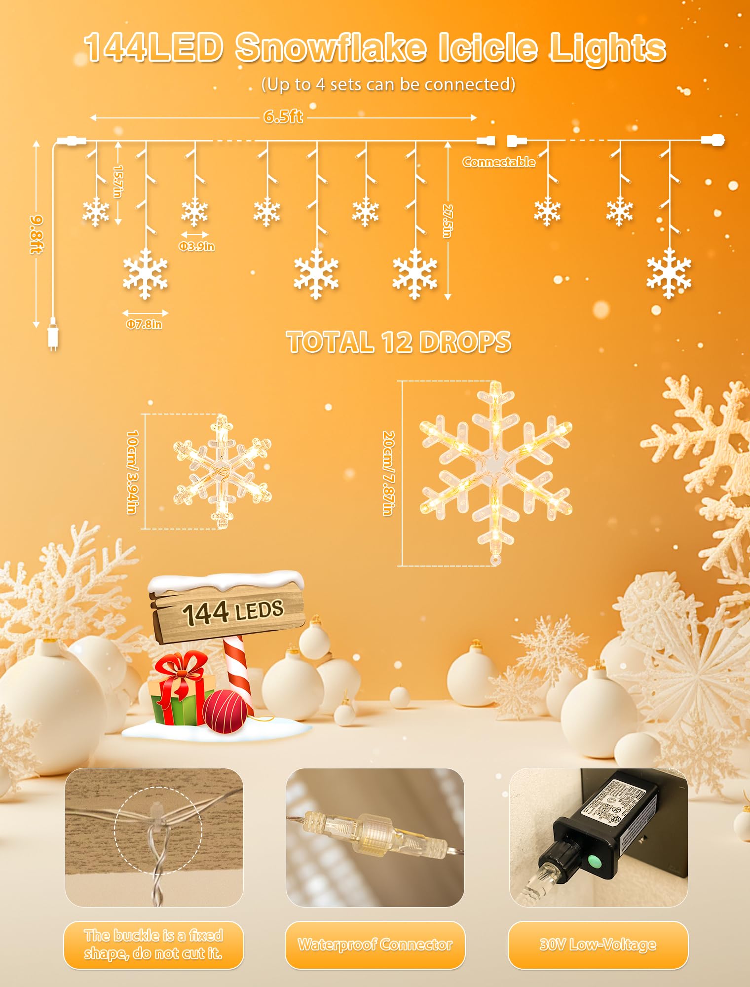 Qunlight Christmas Snowflake Lights,6.5ft 144LED Window Icicle Lights with 12 Drops,8 Modes Timer Connectable Curtain Light Plug in for Bedroom,Eaves,Wedding,Indoor Outdoor Xmas Decor,Warm White