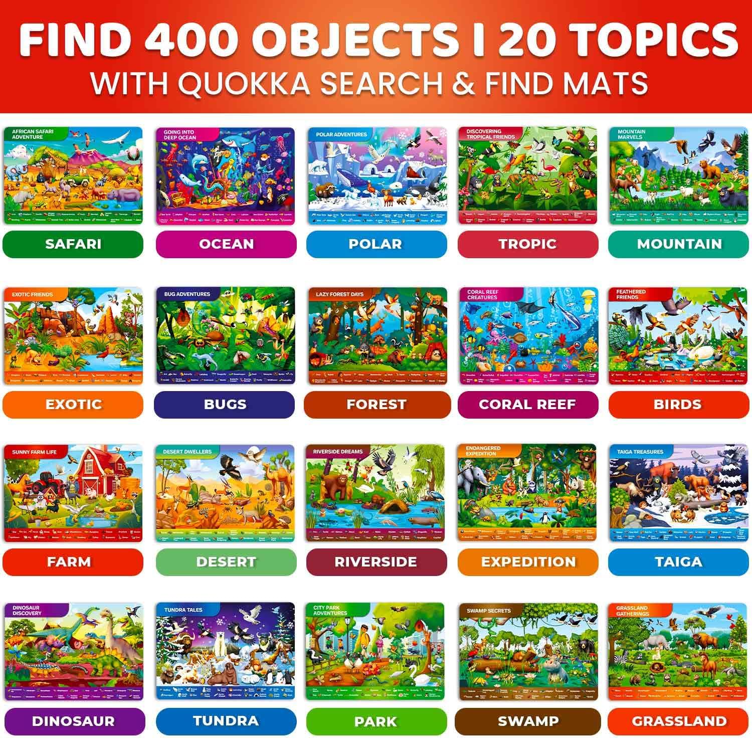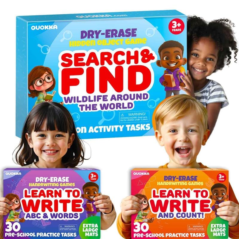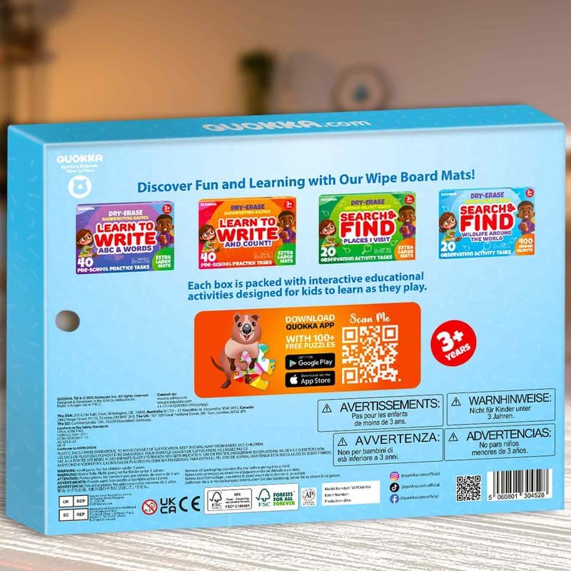 QUOKKA Busy Book Handwriting Practice for Kids - Search & Find - Activity Cards for Kids 3-8 – Reusable Mats with Dry-Erase Marker, Explore 20 Topics, Road Trip Activities, and Travel Games