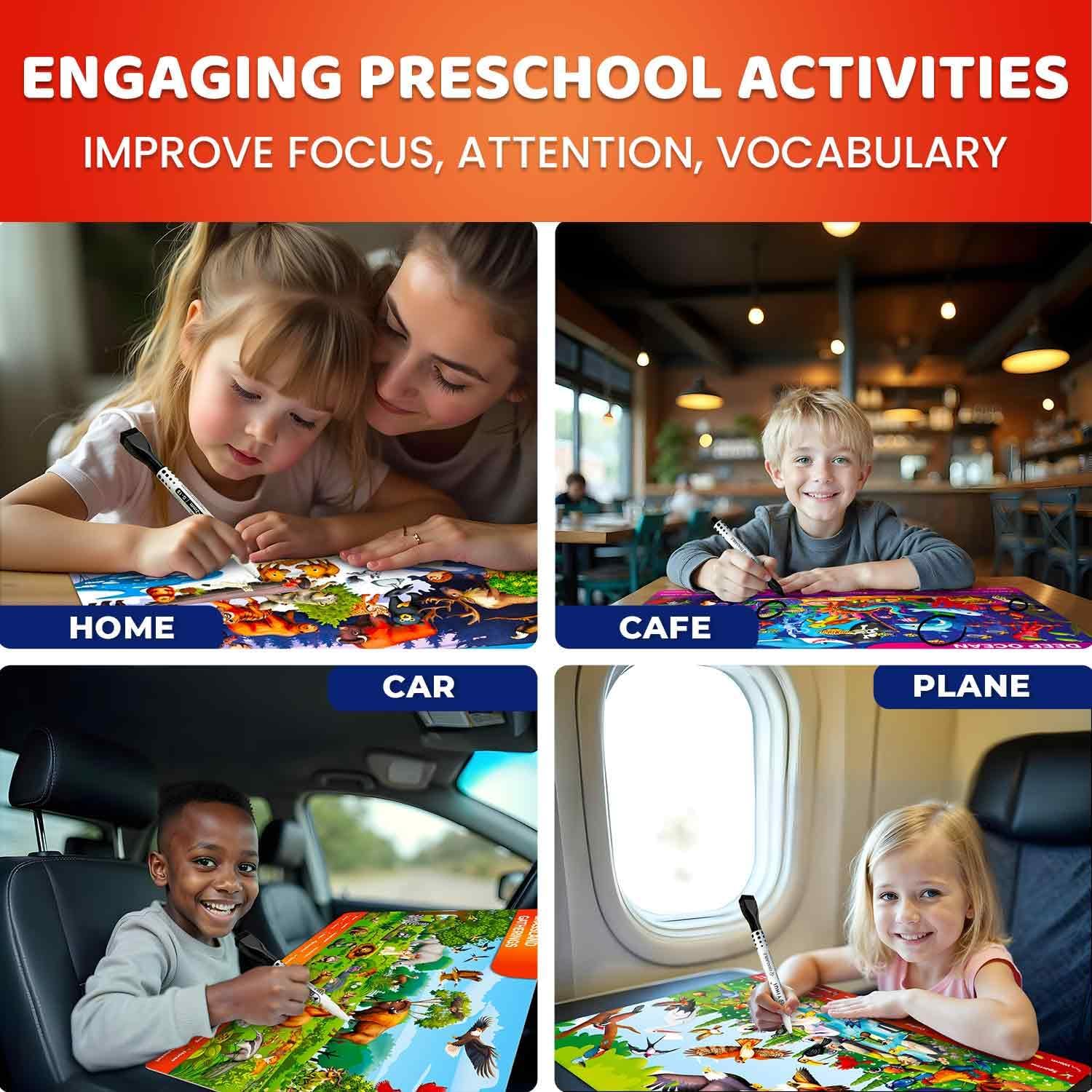- PRESCHOOL ACTIVITIES THAT INSPIRE: From hide and seek games to toddler seek and find books, these mats are designed to enhance observation and thinking skills; a great travel companion for kids car games and activities anywhere they go