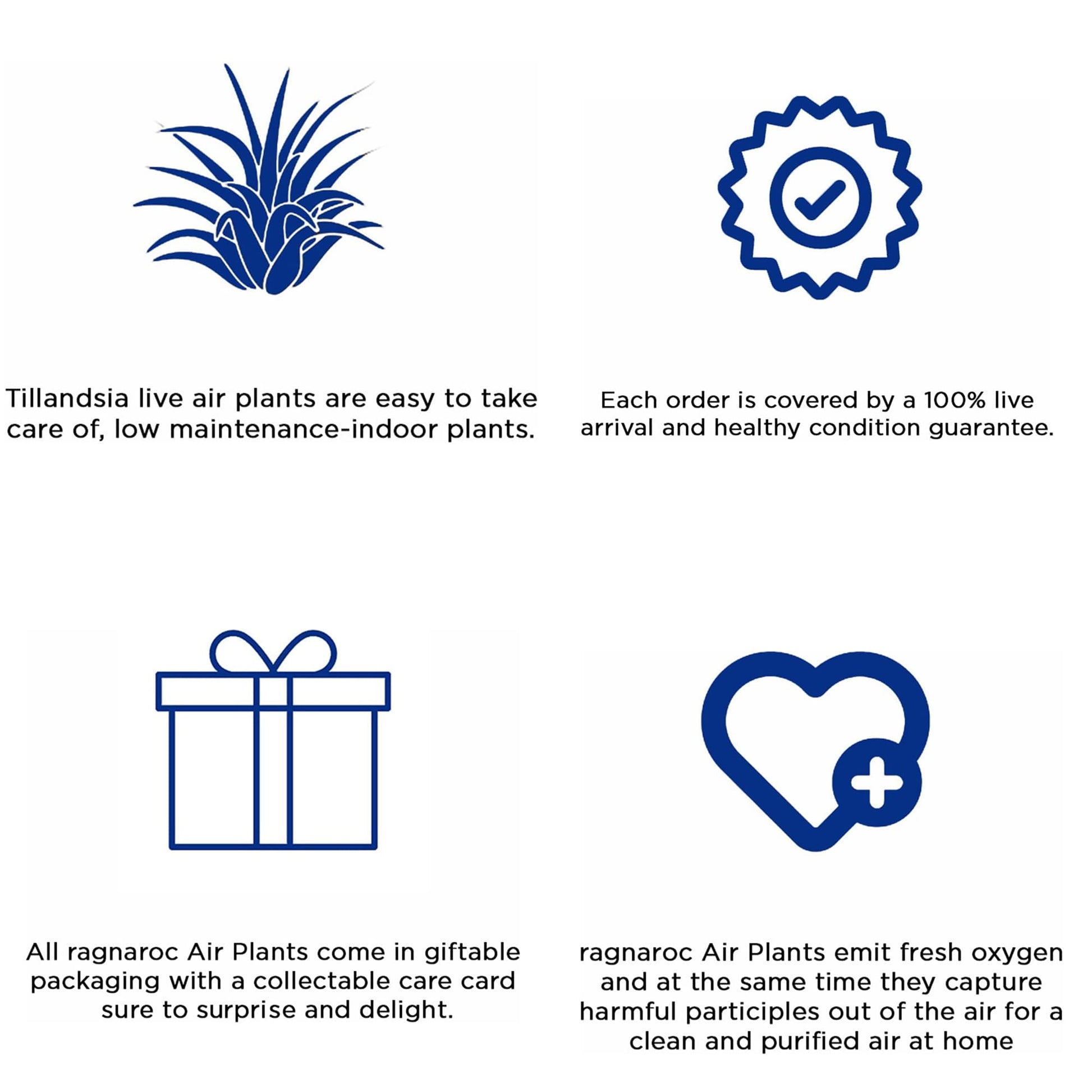 - HEALTHY PLANT ARRIVAL ASSURANCE: ragnaroc is committed to delivering vibrant and thriving air plants to your doorstep. Our live air plants are packed directly from Florida, and every order comes with a promise of their safe and healthy arrival. If, for any reason, you find yourself less than satisfied with our plants, please inform us, and we will promptly arrange a full refund or send you replacement plants.