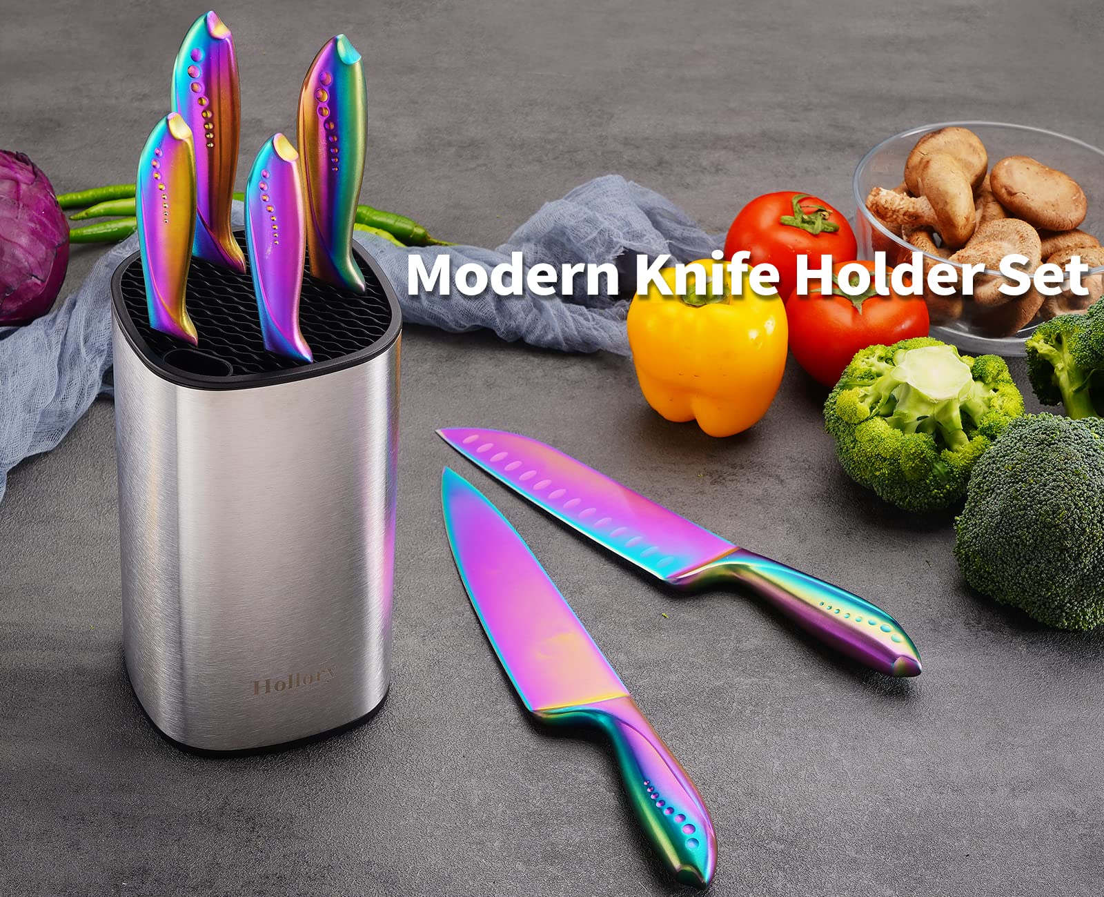 Rainbow Knives Block Set 7 Pieces, Iridescent German High Carbon Stainless Steel Kitchen Knives Pack with Universal Knife Holder