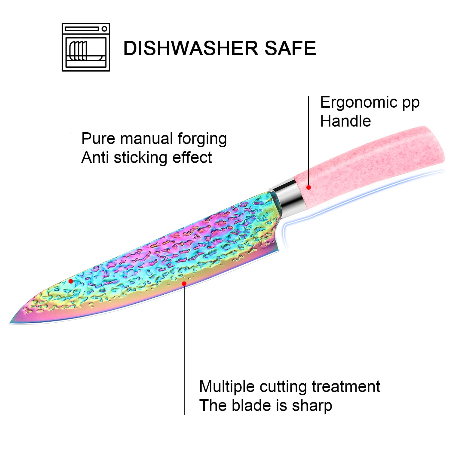 - Non Stick Forging & Hammering Texture and Thick Knife Blade Design - - Unique Forging & Hammering Texture Knife Blade makes this knife nonstick,and easy to maintain. Our tough stainless steel knives are not only sharp, also lightweight, comfortable to hold, and easy to grip. Easily cut anything (such as meat, bread, fruits, and vegetables) and let you enjoy the fun of cooking.