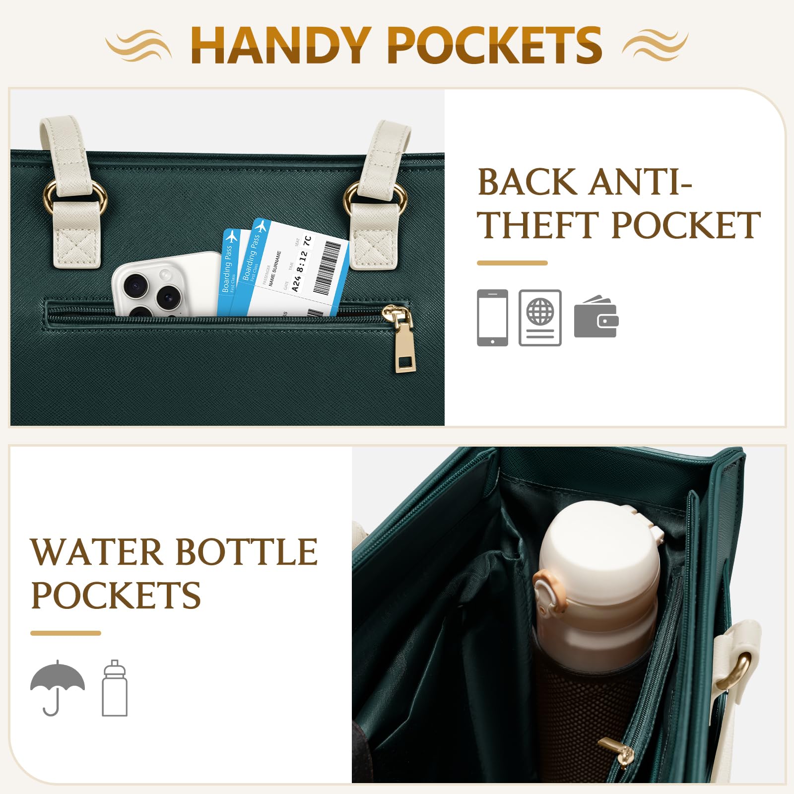 - LARGE CAPACITY & MULTI-POCKETS: This work tote bags for women offers spacious storage capacity. 1 foam padded laptop compartment for 15.6' laptop, 2 large open compartments and 1 middle zipper pocket for files and books, 1 wall zippered pocket for personal belongings, multi-functional pockets with keychain for keys, pens, wallet etc, 2 inner side pockets for water bottle and umbrella. Front magnetic pocket for items easy to access and back zipper pocket for phone or passport
