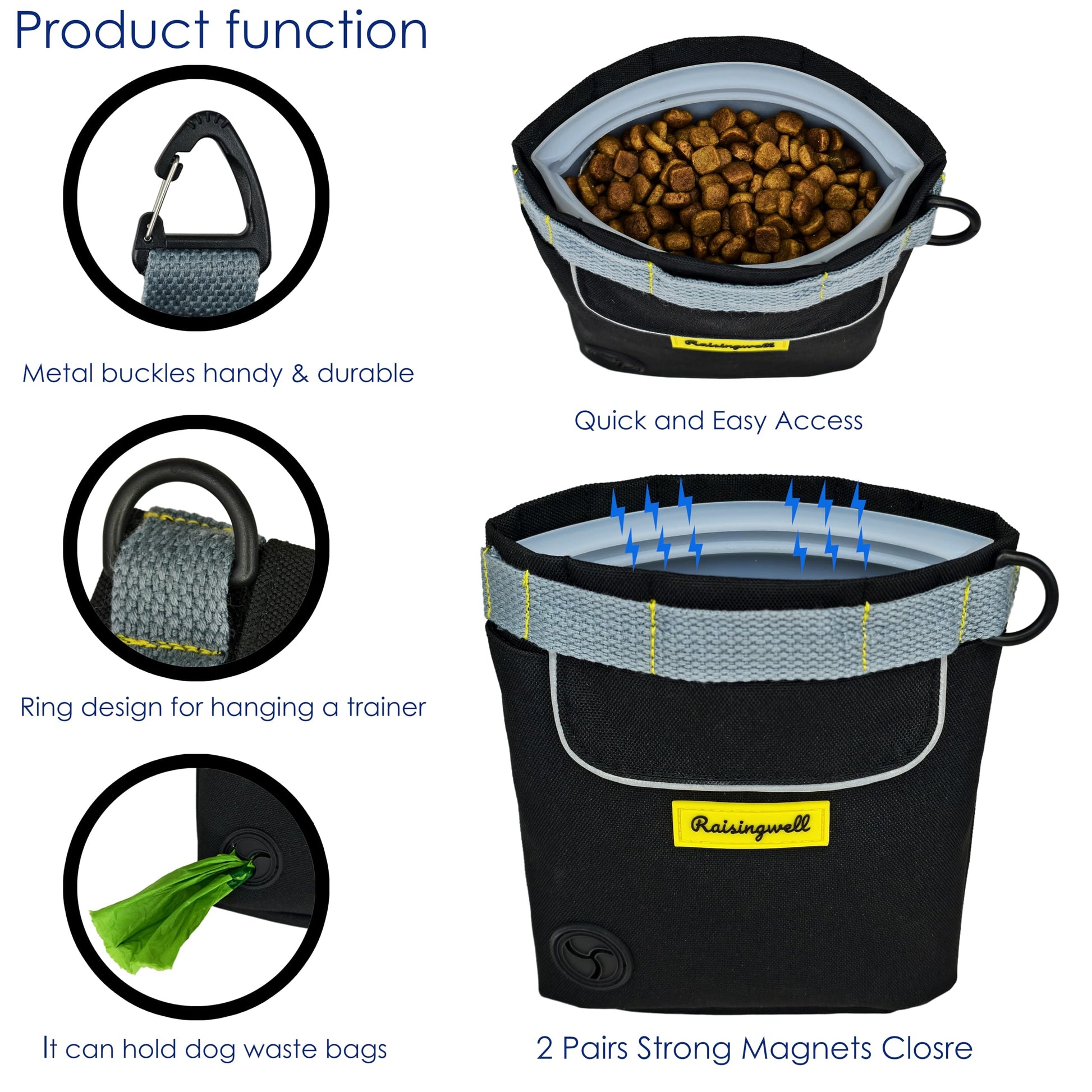 - 5.Durable Tech Material: Raisingwell's dog treat training pouch is made from durable, washable, and non-toxic fabric. Notably, its waterproof lining solves the problem of difficult-to-clean interiors of training bags, making it a great choice for your dog treat bag or dog treat fanny pack.
