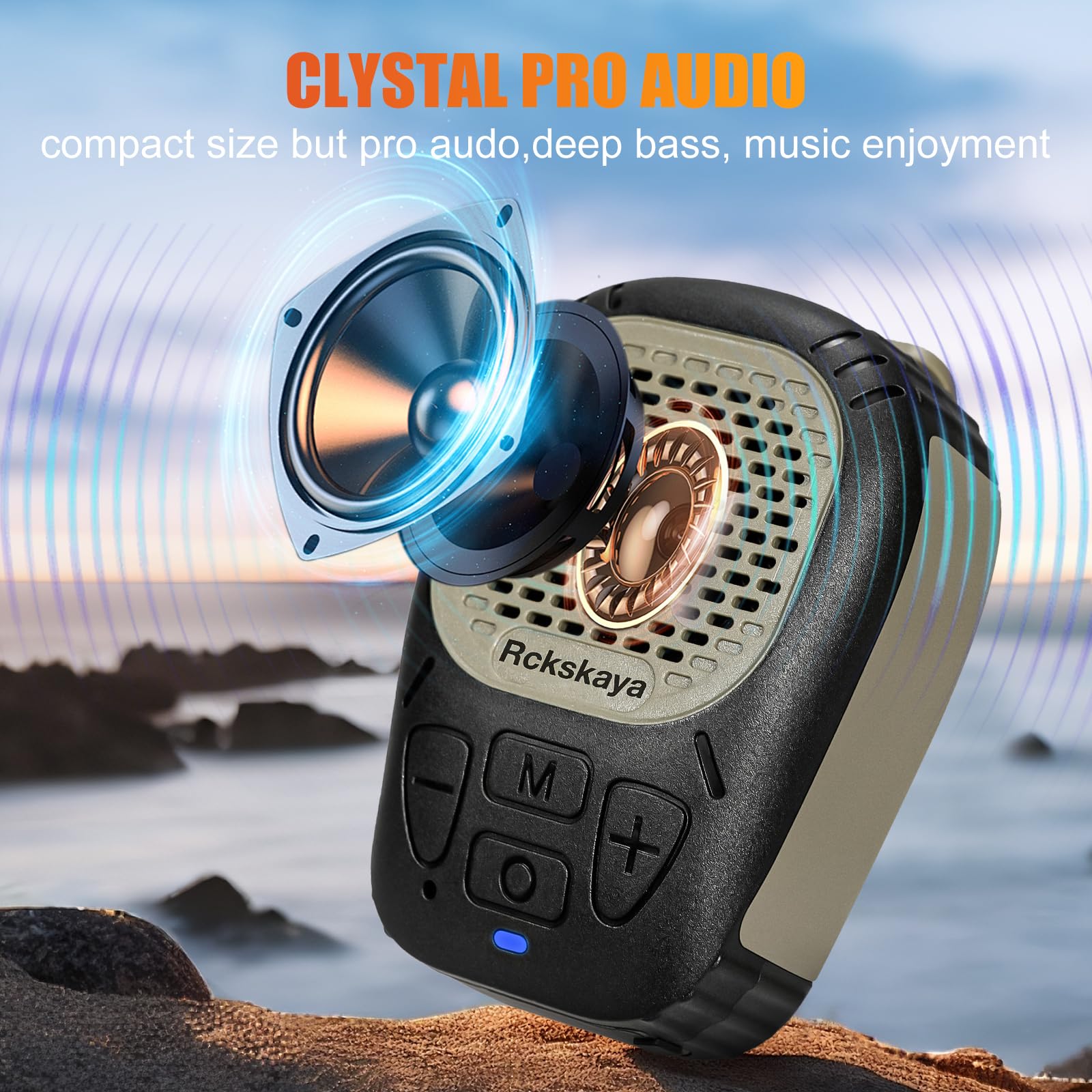 - [IP56 Waterproof and Drop Resistance] The bluetooth speaker waterproof with clip-on utilize the IP56 technology and rubber covered to protect internal components from water and dust. It is a robust choice for any environment, whether you are at jobsite or by the lake without any worry about dust or water damage of this portable wearable speaker